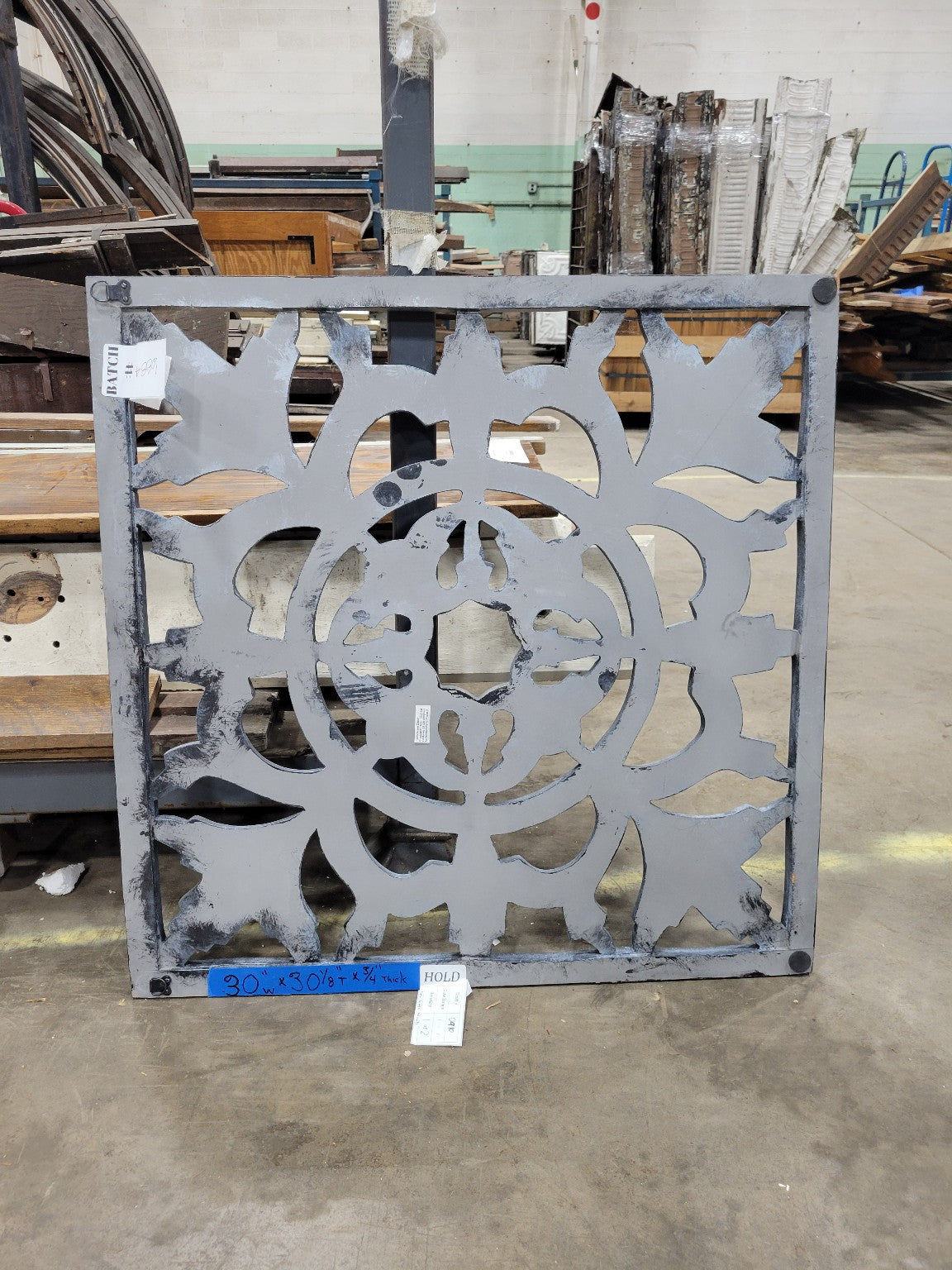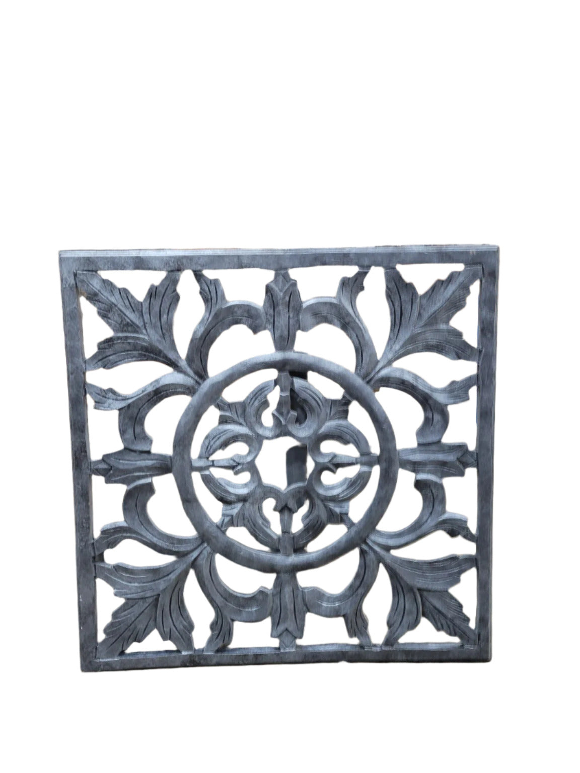 This vintage carved wood panel showcases an intricate floral and scrollwork motif, framed in a sturdy square shape. Measuring approximately 30" wide by 30⅛" tall and ¾" thick, the panel features a distressed gray painted finish, giving it a timeworn, authentic charm. Originally crafted for decorative architectural use, it is perfect as a wall accent, headboard insert, or a stylish backdrop for both indoor and sheltered outdoor spaces. Some surface imperfections and aging are present, enhancing its rustic appeal.