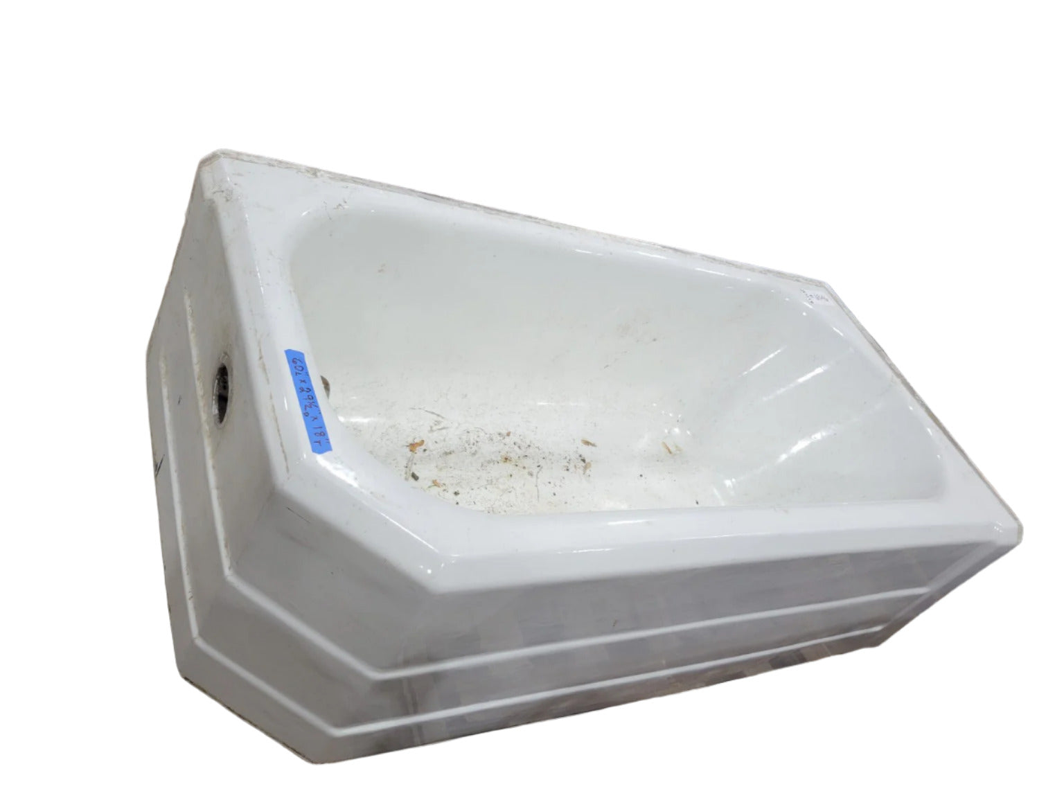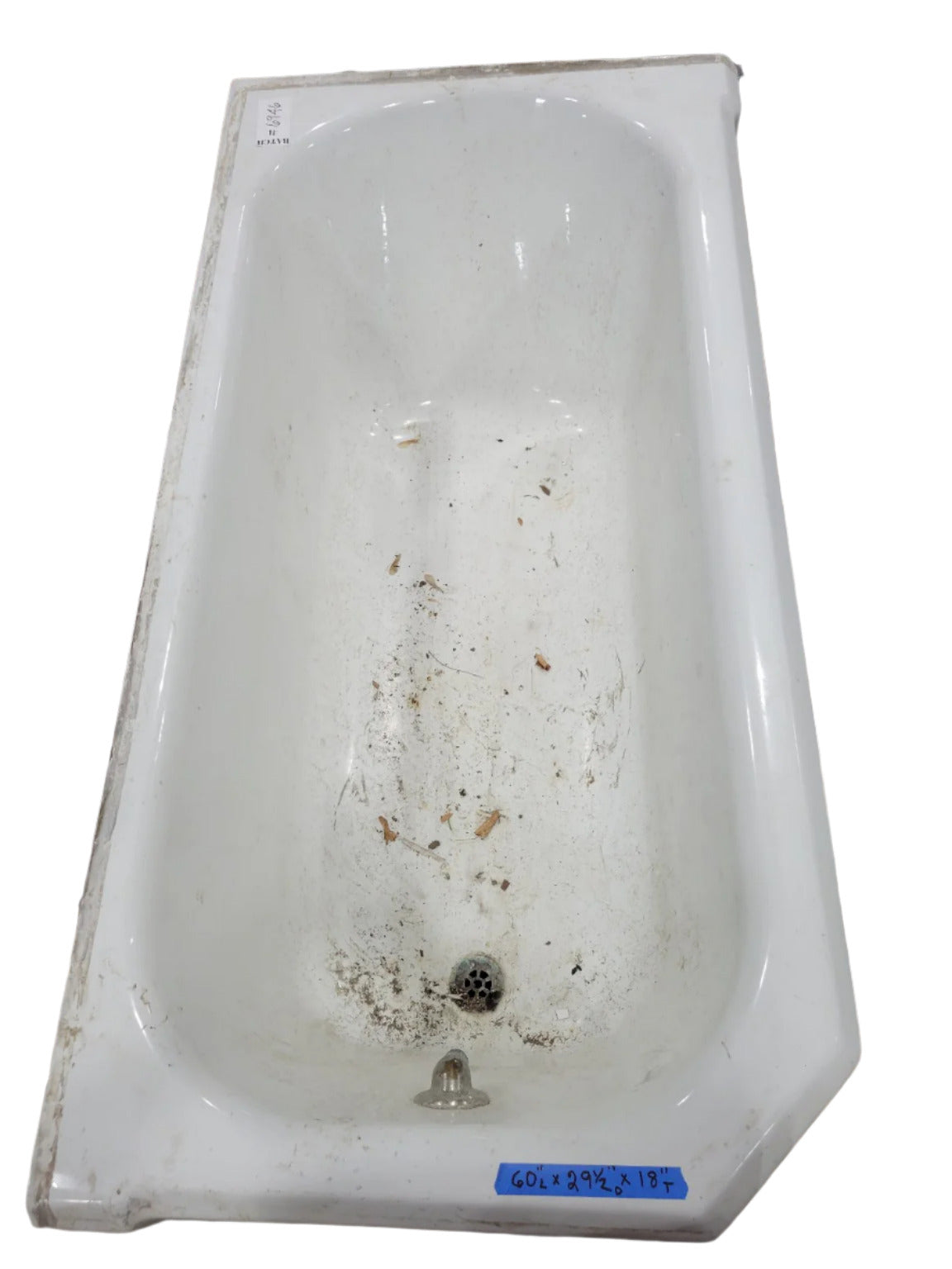 This vintage cast iron bathtub features a classic white enamel coating and a recessed alcove design with slightly faceted front corners. Its sturdy construction and clean lines make it ideal for both restoration projects and utilitarian retrofits. Though surface wear and discoloration are visible inside the basin, it remains structurally solid—perfect for reglazing or creative repurposing into a planter, outdoor basin, or industrial-style furniture base.