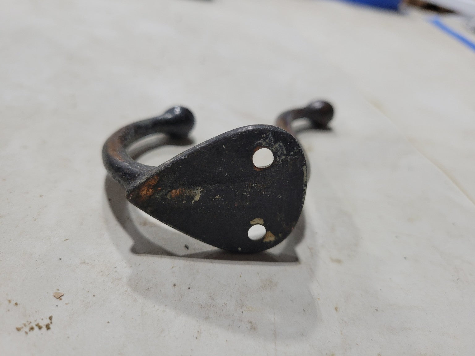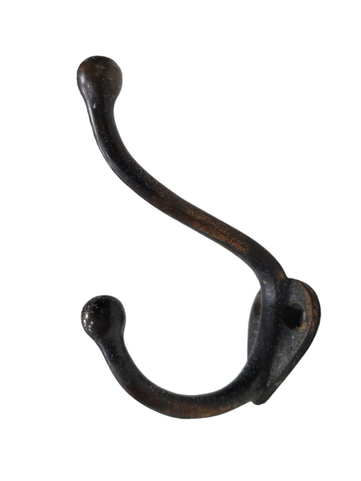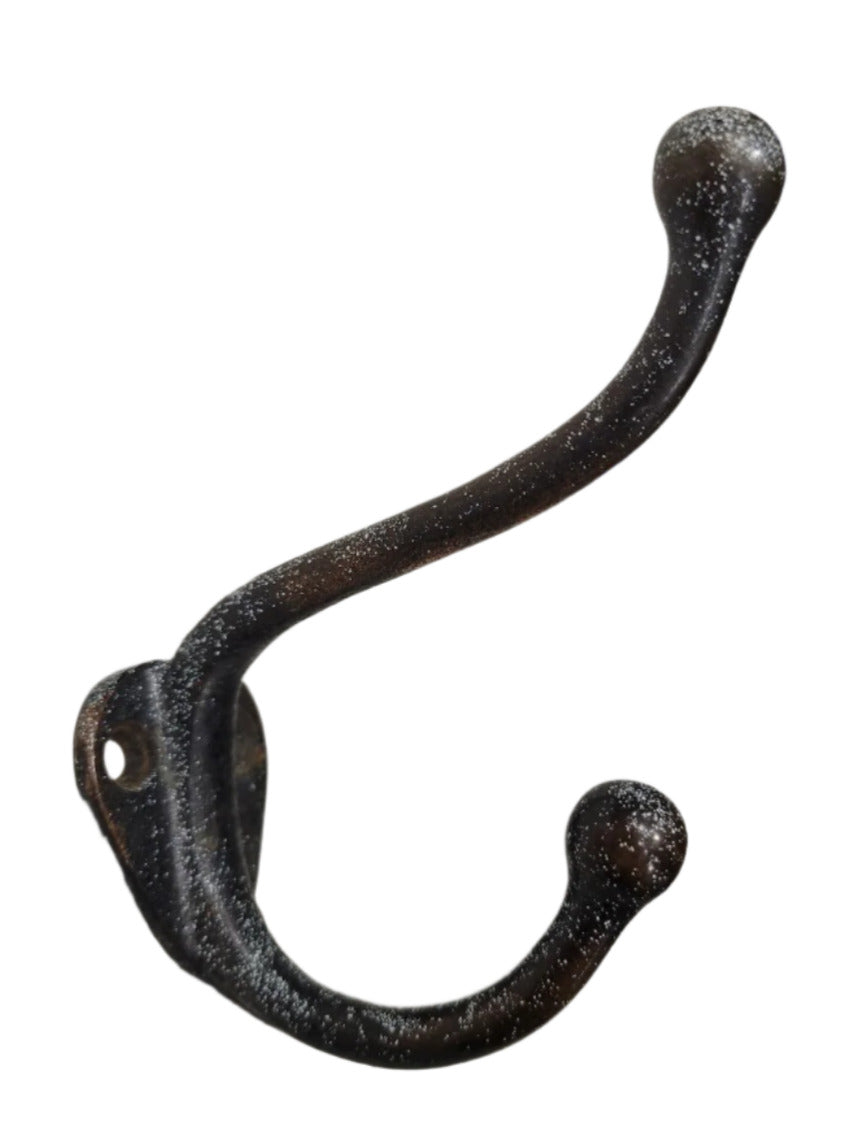 This vintage double coat hook is crafted from solid cast iron and features a graceful arched form with round ball tips. With a footprint of 1 ¼" wide x 2 ¾" tall and a 3 ½" projection, this piece is ideal for wall mounting on doors, hall trees, or entryway boards. The surface retains an aged blackened patina with hints of rust, offering a timeworn, industrial look that blends seamlessly into farmhouse, utilitarian, or traditional decors. Two mounting holes are provided in a teardrop-style backplate for secure installation.