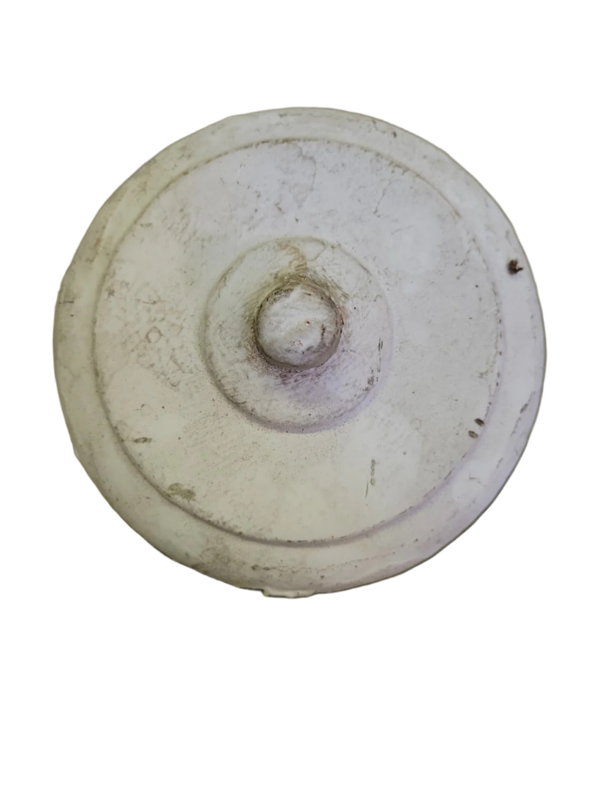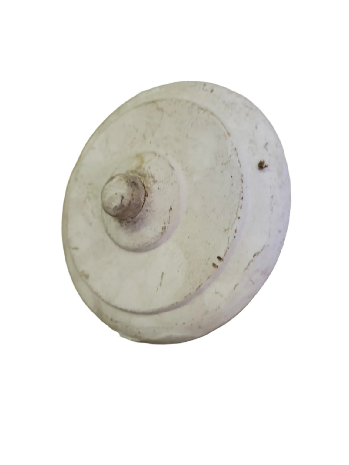 This vintage cast iron canopy, measuring 5 inches in diameter, was originally designed as a ceiling mount cover for pendant or hanging light fixtures. The canopy features a threaded center hole to accommodate downrods or fixture stems, and its underside retains traces of original yellow and brown paint, giving it a timeworn, industrial character. The outer surface is painted white, showing age and wear consistent with decades of service. Ideal for restoring antique lighting or creating an authentic industrial or farmhouse-style fixture.