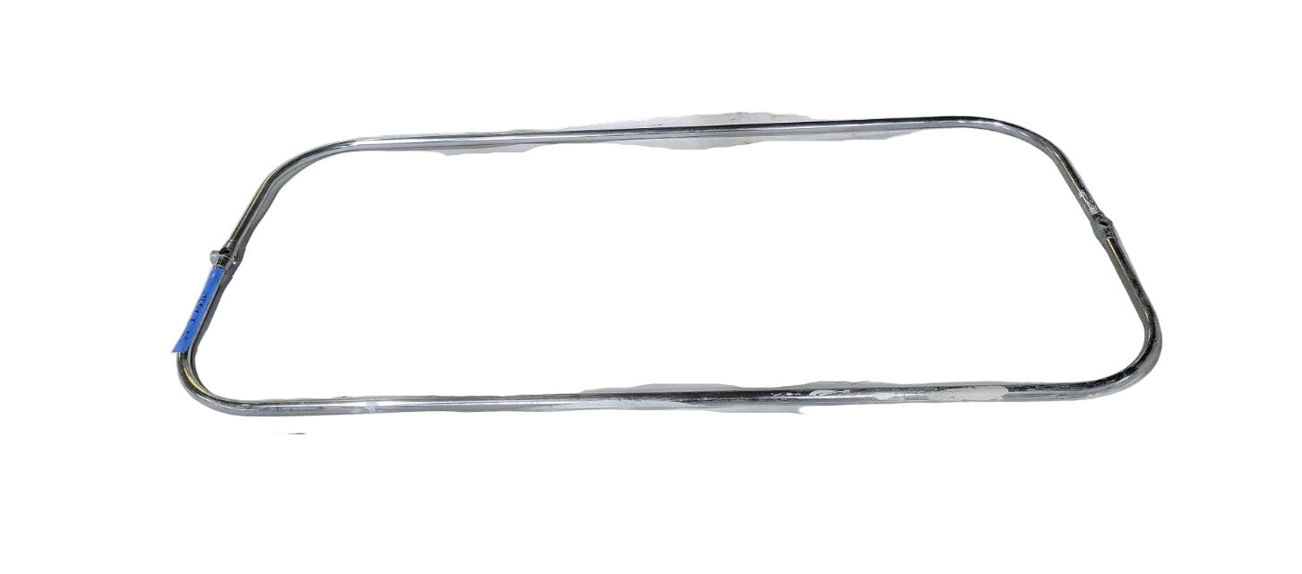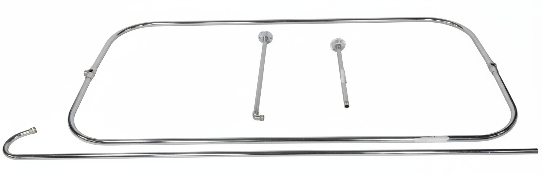 A vintage oval shower curtain rod designed for use with freestanding or clawfoot bathtubs. Constructed from sturdy chrome-plated steel tubing, this ceiling-mounted frame includes two vertical support rods and original mounting hardware. The rod’s clean mid-century lines and reflective finish offer both durability and style—perfect for a restoration project or classic bathroom remodel.