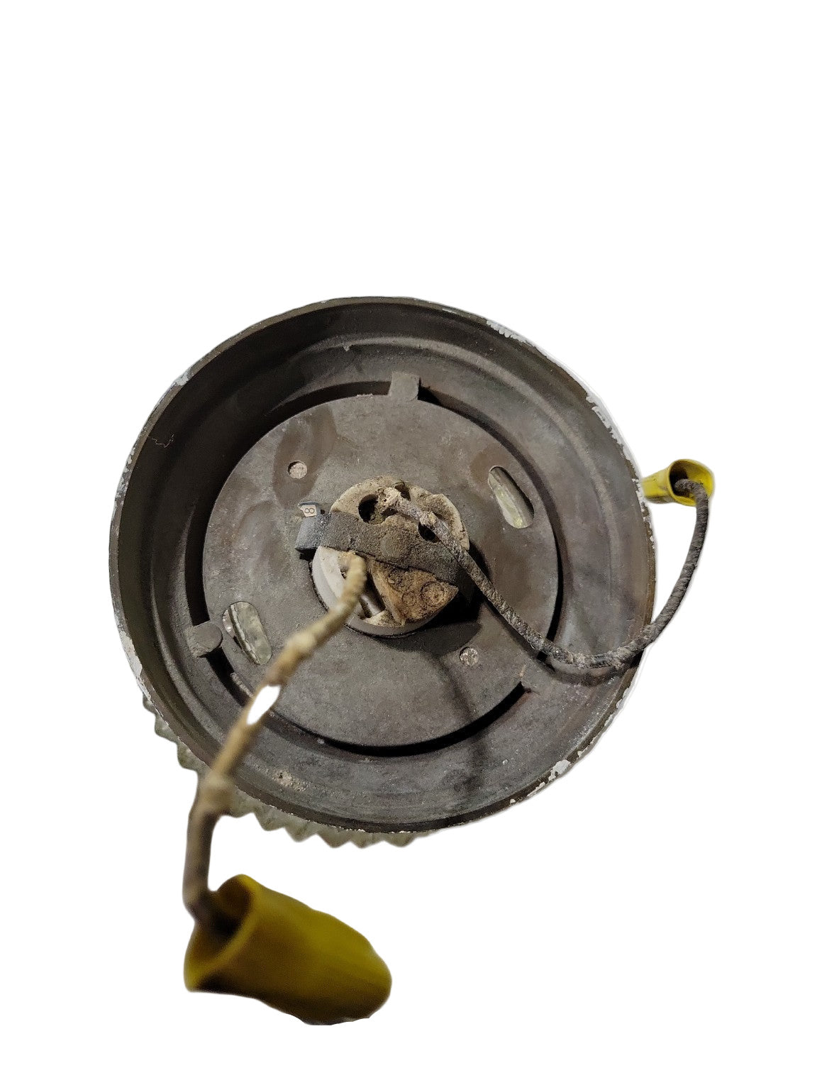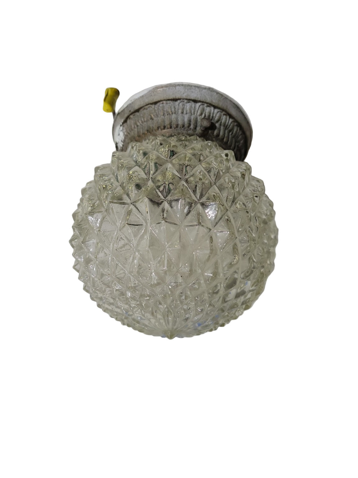 A charming vintage ceiling-mount light fixture featuring a faceted diamond-pattern glass globe and cast metal base. The textured glass refracts light beautifully, creating a warm, prismatic glow. The metal base retains its original painted finish with mild oxidation and patina, adding authentic aged character. Perfect for hallways, porches, or small rooms needing a touch of vintage charm.