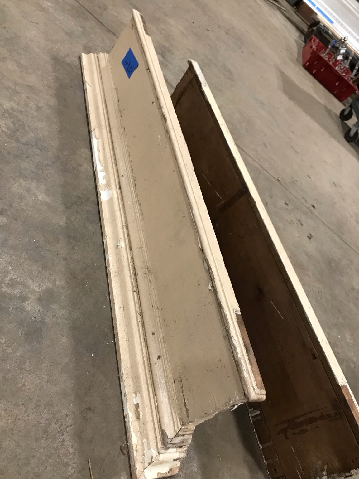 ![]() | Description: Architectural door header trim with a substantial profile, painted in a worn cream color, showing signs of age and paint chipping. This piece is ideal for decorative restoration or to add period authenticity to architectural projects. Era: Style: Technique: Tools Used: History: Manufacturer / Maker: Measurements: