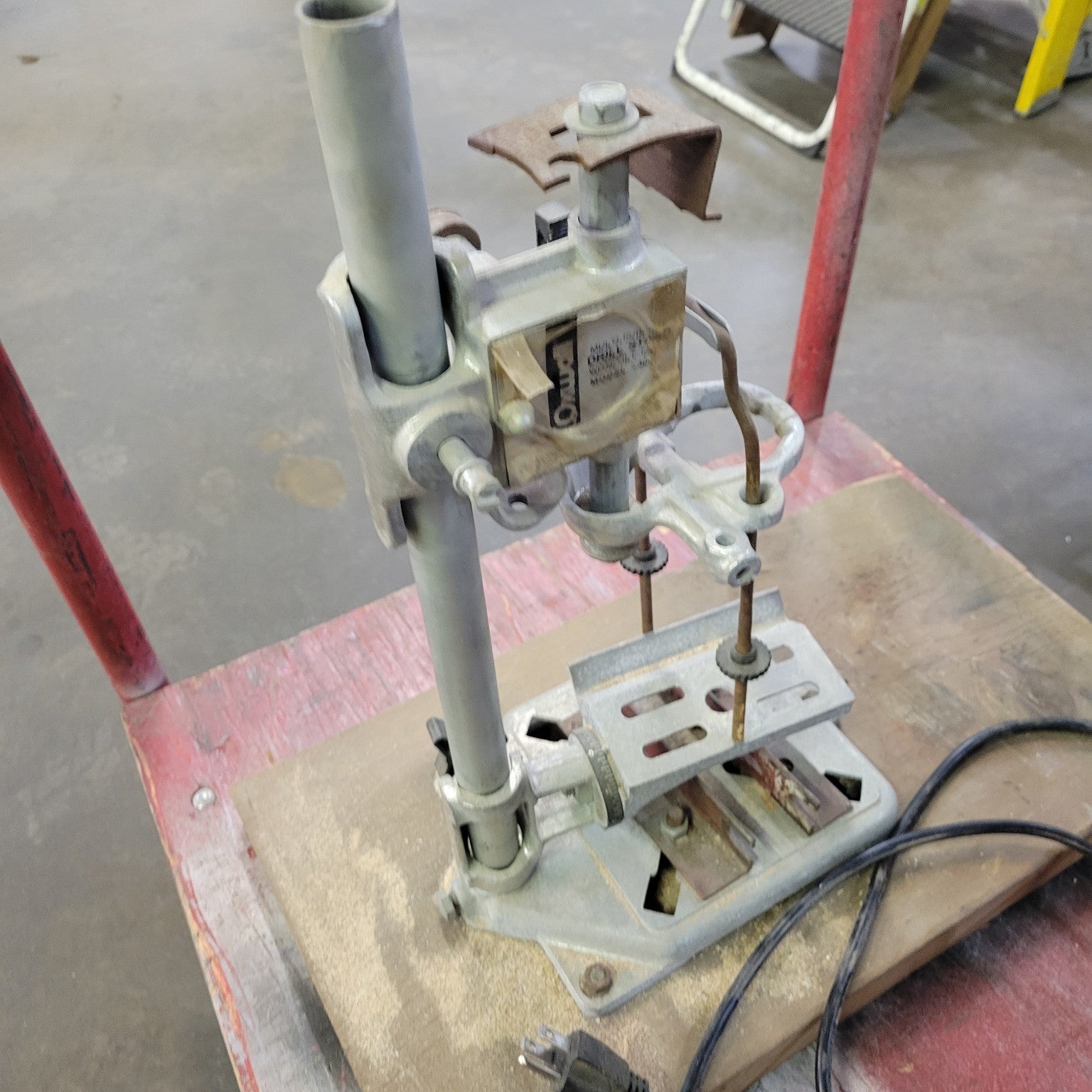 Description: A vintage drill press stand designed to convert a hand-held drill into a stable drill press. The stand features a sturdy base, adjustable height mechanism, and a lever system for precision drilling. It appears to be in fair, used condition with some surface rust on the components.