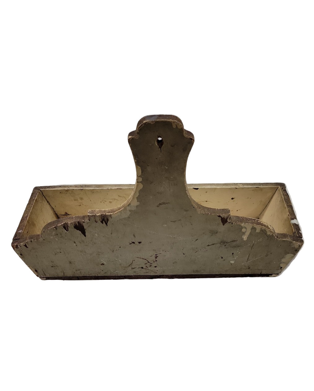 This charming vintage wall-mounted box features hand-painted folk art decoration in a Pennsylvania Dutch or Americana style. Measuring 13 ⅜" wide, 4 ½" deep, and 8 ⅞" tall, the box has a scalloped backboard with a mounting hole for easy hanging. It’s finished in an aged cream color and adorned with red tulips, scrolling green vines, and a central heart motif. The piece shows visible signs of wear, chipped paint, and patina consistent with age, adding to its rustic appeal. Ideal for holding mail, utensils, dried flowers, or as a decorative accent in a farmhouse or cottage-style space.