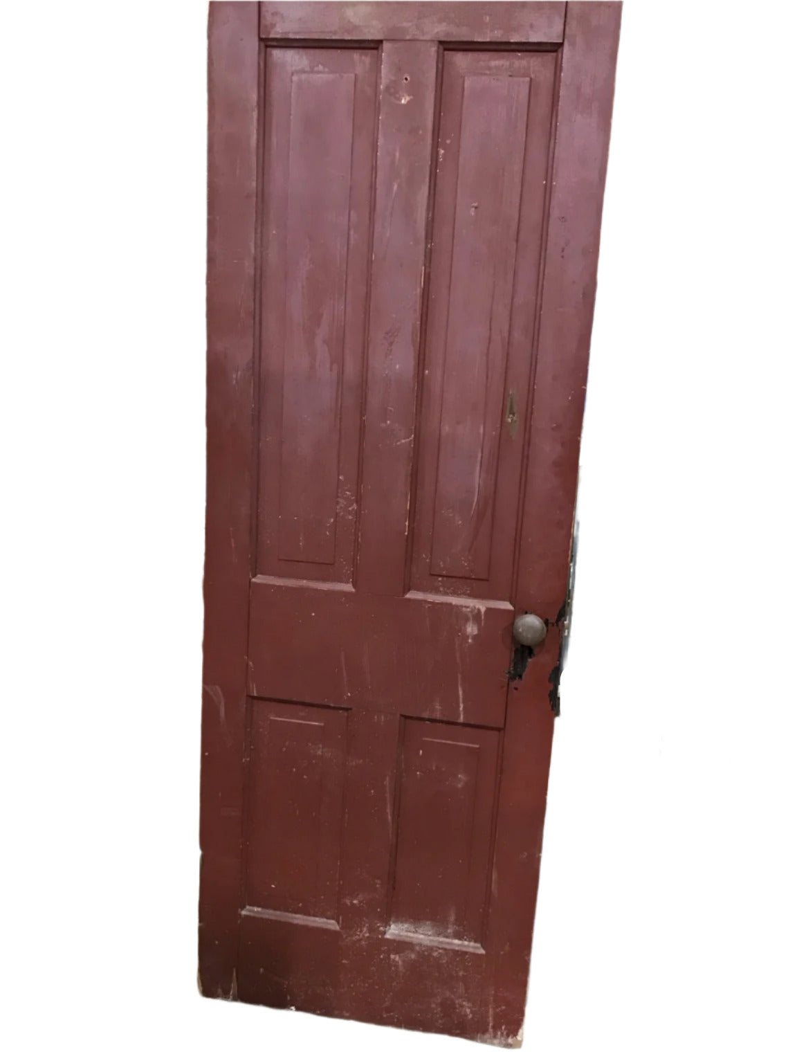 ![]() | Description: Vintage wooden door with four recessed panels, painted a deep burgundy-red color. The door has a round metal doorknob, and it exhibits significant wear, particularly around the lock area, where the wood is heavily damaged. Era: Style: Material: Finish: Measurements: