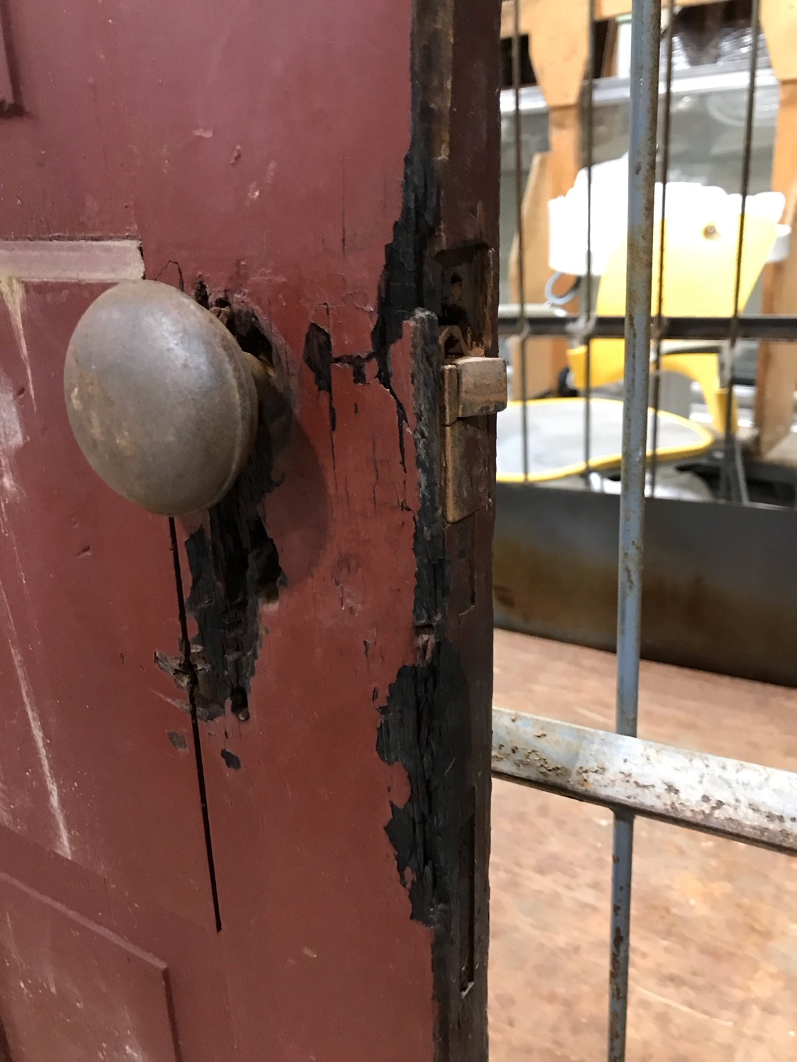 Vintage wooden door with four recessed panels, painted a deep burgundy-red color. The door has a round metal doorknob, and it exhibits significant wear, particularly around the lock area, where the wood is heavily damaged.