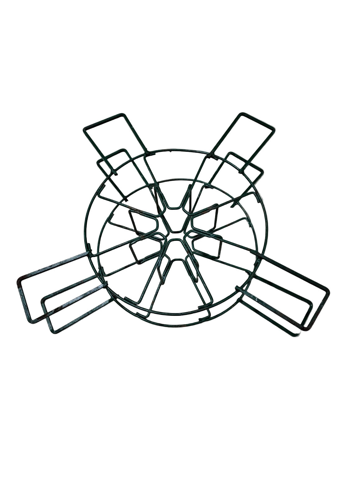 This vintage green wire piece is likely a spool holder used for organizing barbed wire, Christmas lights, or other flexible materials. Measuring 20 ¾" in diameter and 4 ½" tall, the structure features a fixed circular frame with six radial arms and supportive vertical ribs. The welded steel construction is coated in green enamel and shows light surface wear and patina appropriate to age and use. Its functional, open-frame design makes it suitable for use in the workshop, garden, or storage area, or as an industrial display piece.