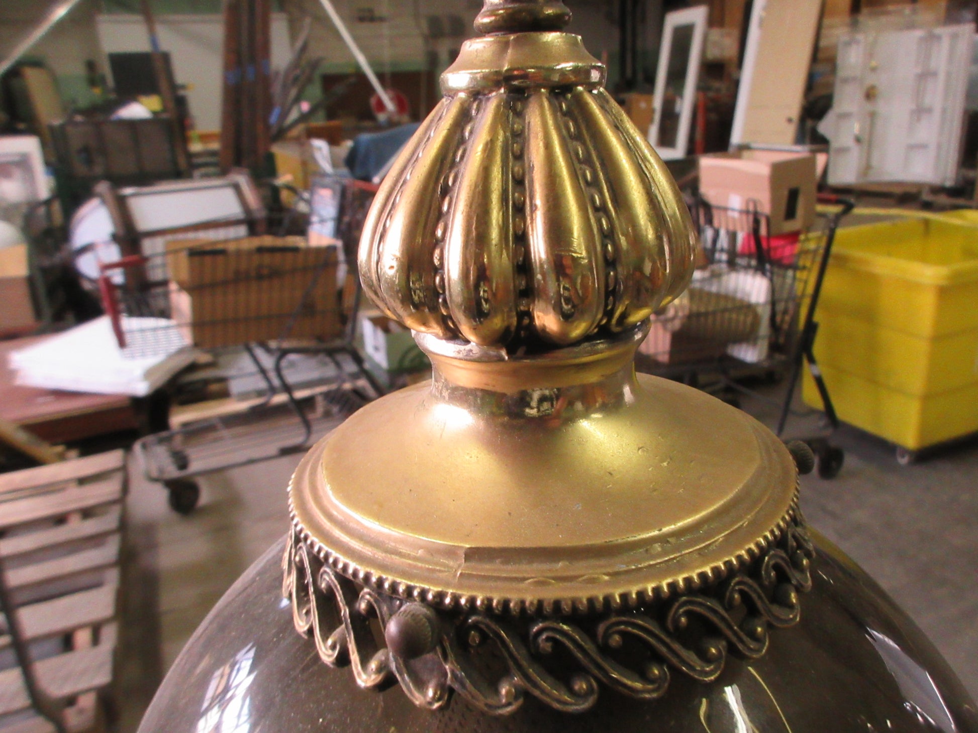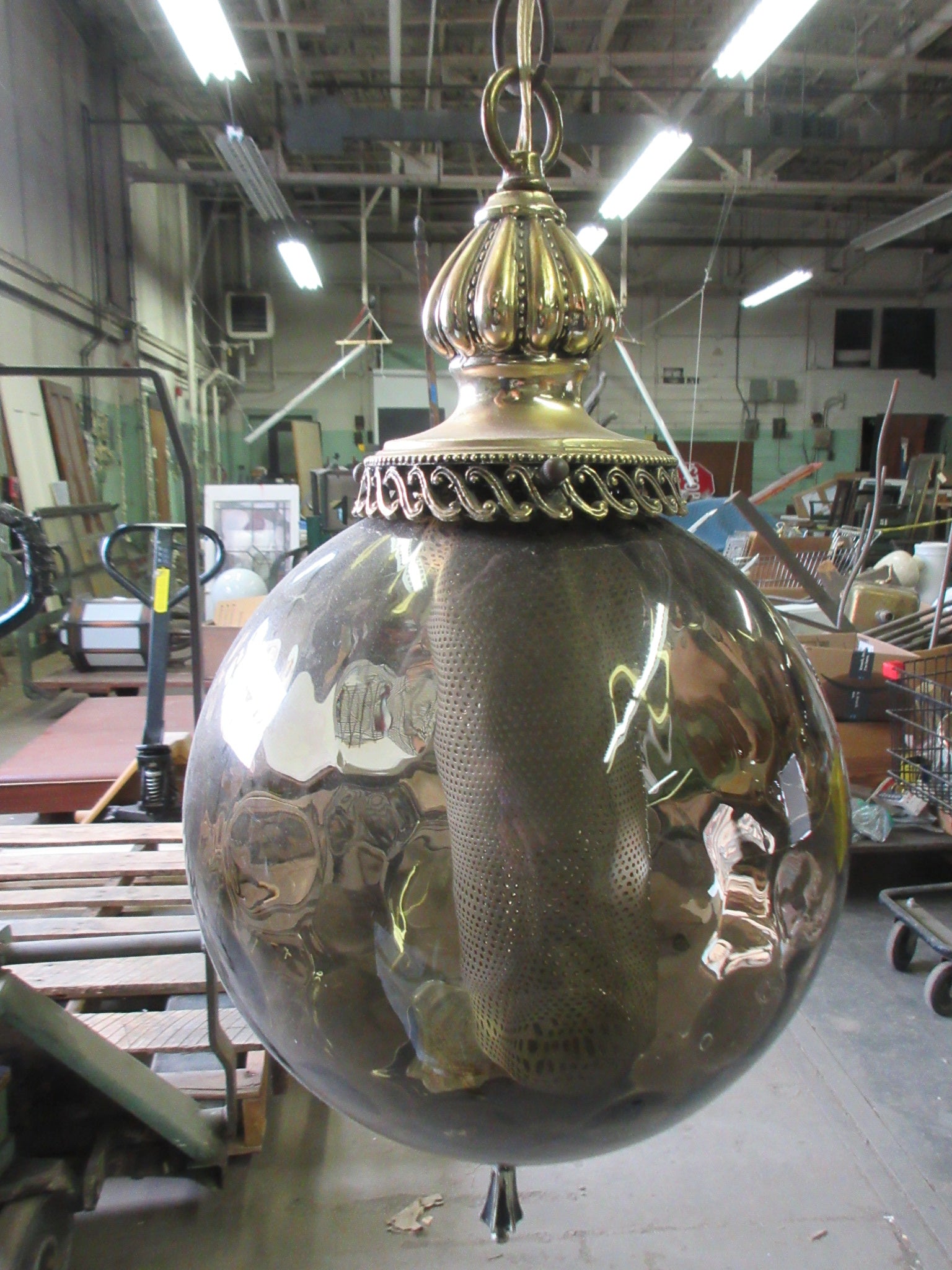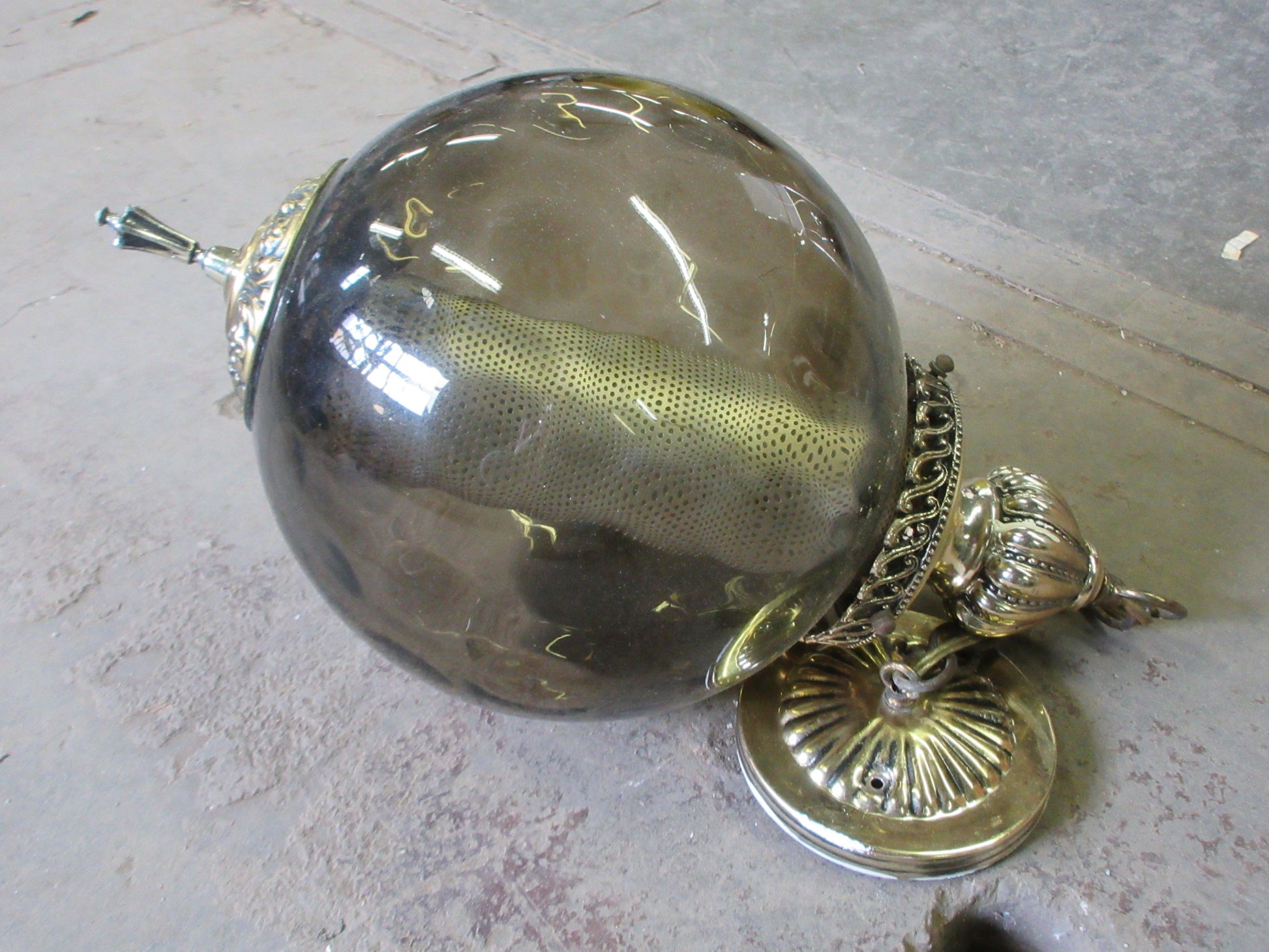 Description : Ceiling mount swag lamp with smokey shade and brass hardware.