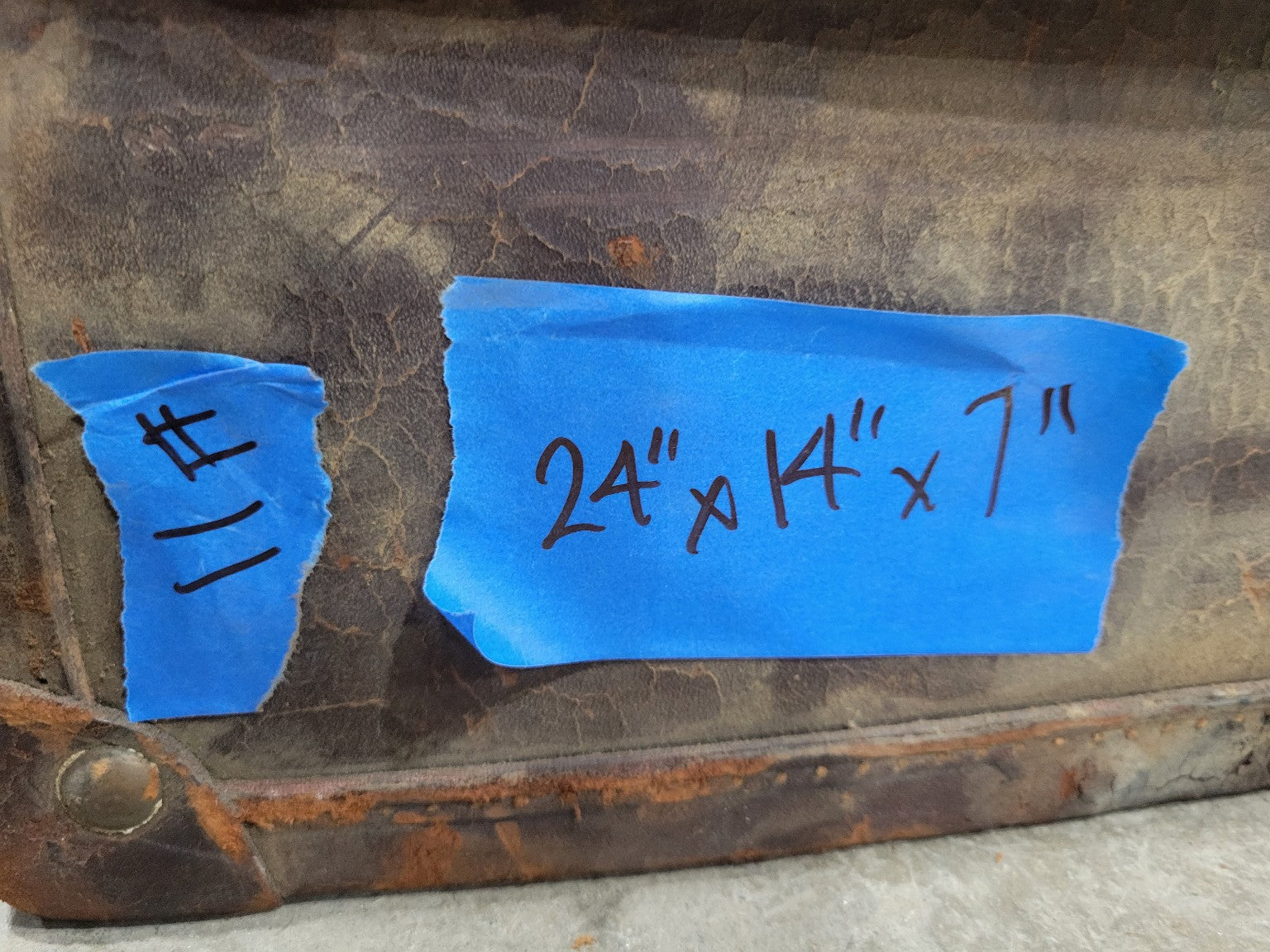 This well-worn vintage suitcase features a classic hard-shell structure wrapped in cracked leather with reinforced metal corners and faded fabric-lined interior. Measuring 24" wide, it includes original buckled straps, a wrapped handle, and metal latches—some rusted, all bearing signs of extensive travel and age. Though the surface is rough, it makes for an excellent prop, display piece, or upcycled decor element. Ideal for rustic retail staging or creative reuse.