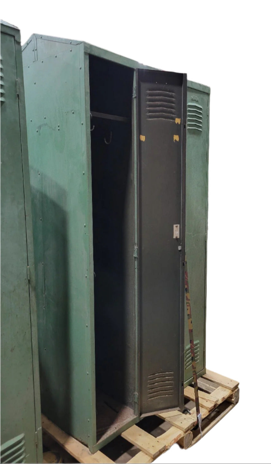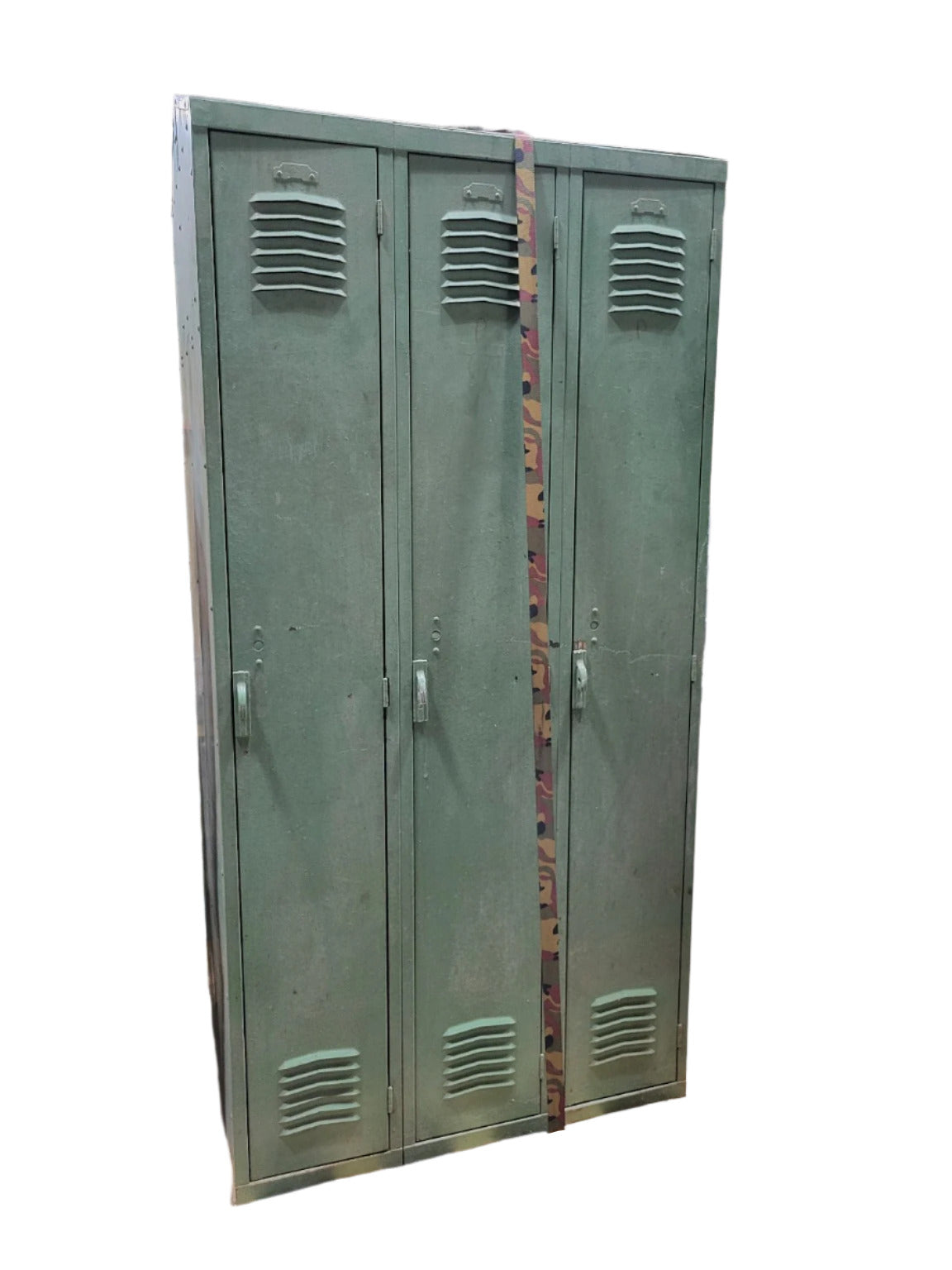 This vintage triple-door steel locker unit stands 77" high and features a robust military-green patina. Measuring 36" wide and 30" deep, the locker includes vented doors, original interior hooks, and reinforced doors with built-in padlock hasps. Designed for heavy use, it bears scuffs, dents, and paint wear consistent with decades of service—perfect for vintage-inspired storage, prop use, or upcycled design projects. The unit sits solidly and offers ample storage in each of its three compartments.