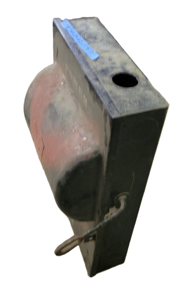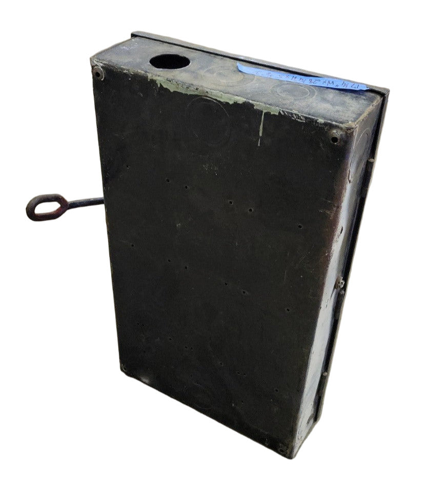 Heavy-gauge steel fabrication with mechanical crank and stenciled lettering.