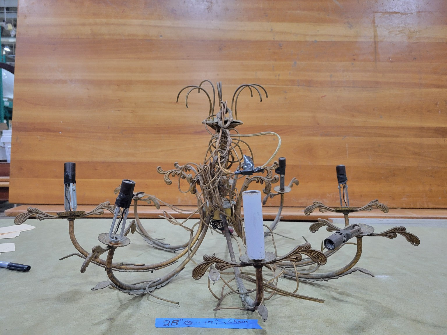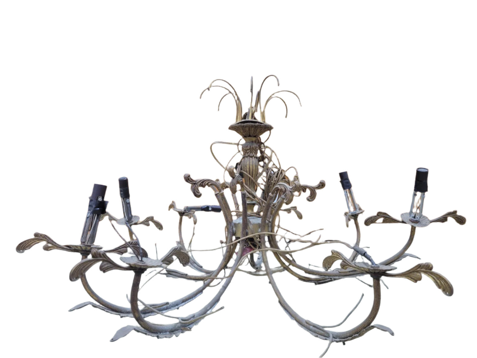 This ornate vintage chandelier is crafted in the Italian tole style, featuring a detailed arrangement of leaf and floral motifs in a warm gilt finish. With eight scrolled arms radiating from a central sculptural stem, the chandelier exhibits expressive botanical forms and curling tendrils. It includes its original hanging chain and wiring, though some sockets are incomplete and it will require rewiring for functional use. Its distressed finish, bent arms, and scattered wear add to the authentic vintage character, making it ideal for restoration or dramatic decorative statement in a rustic or eclectic interior. Needs rewiring.
