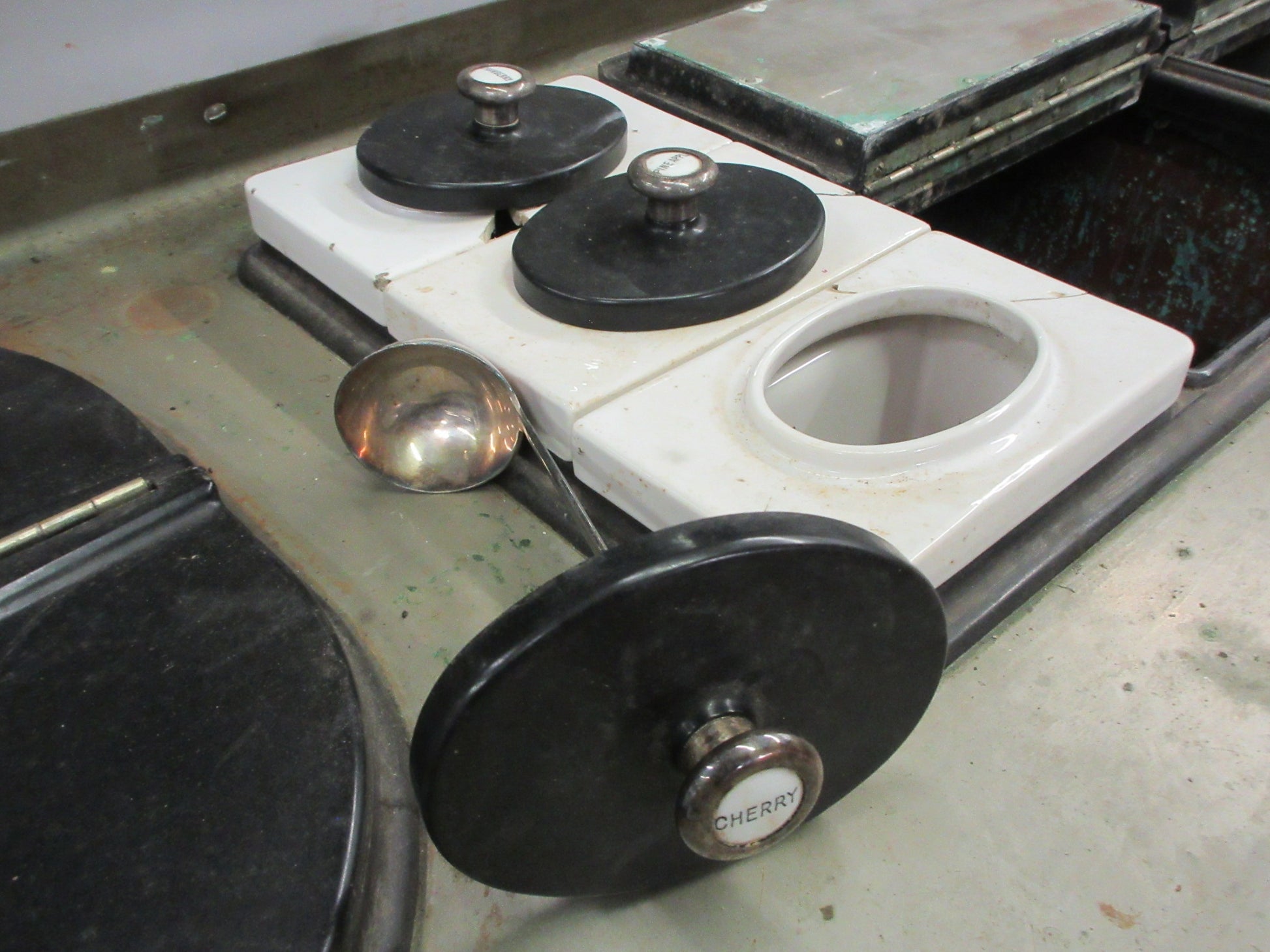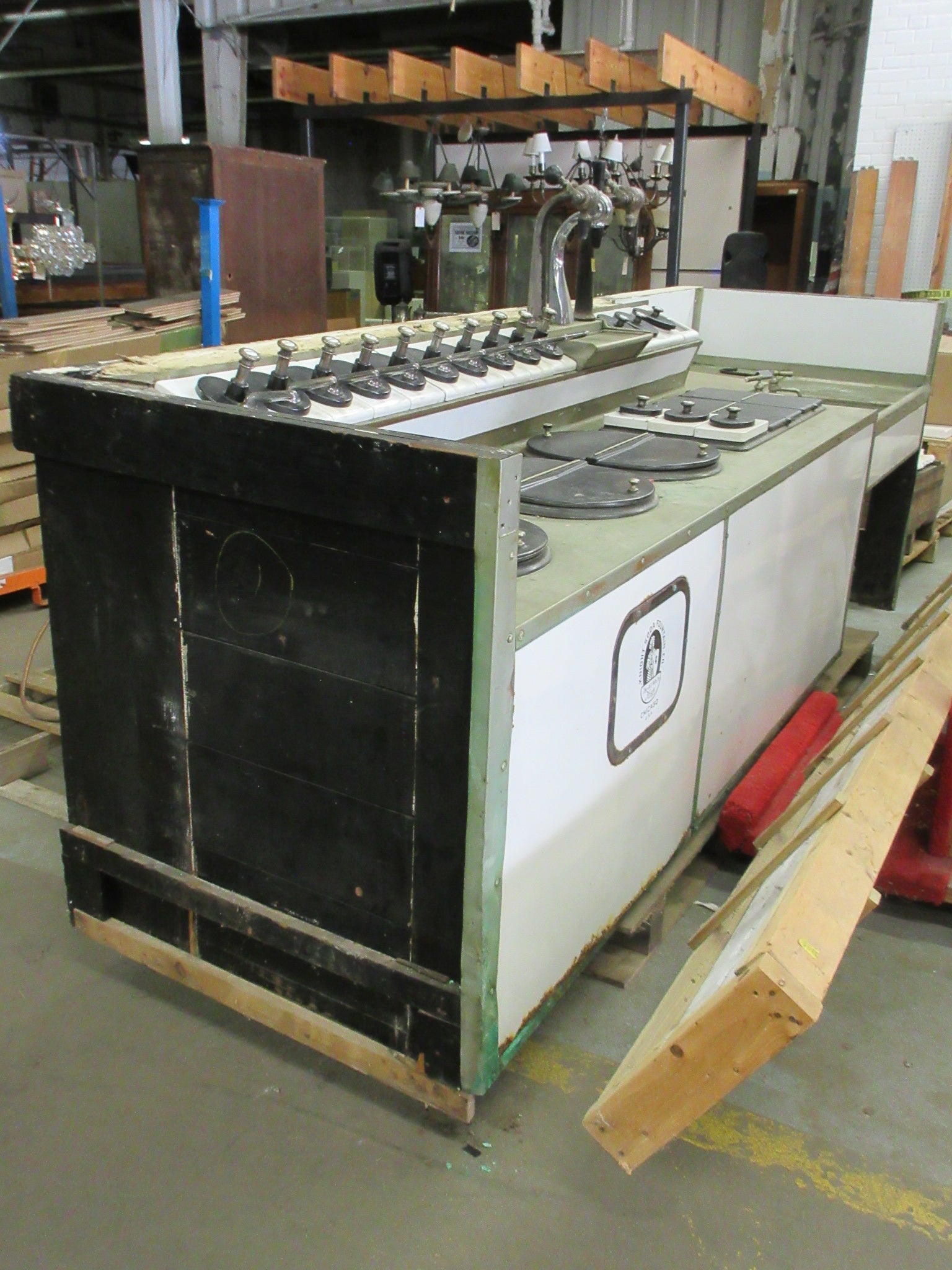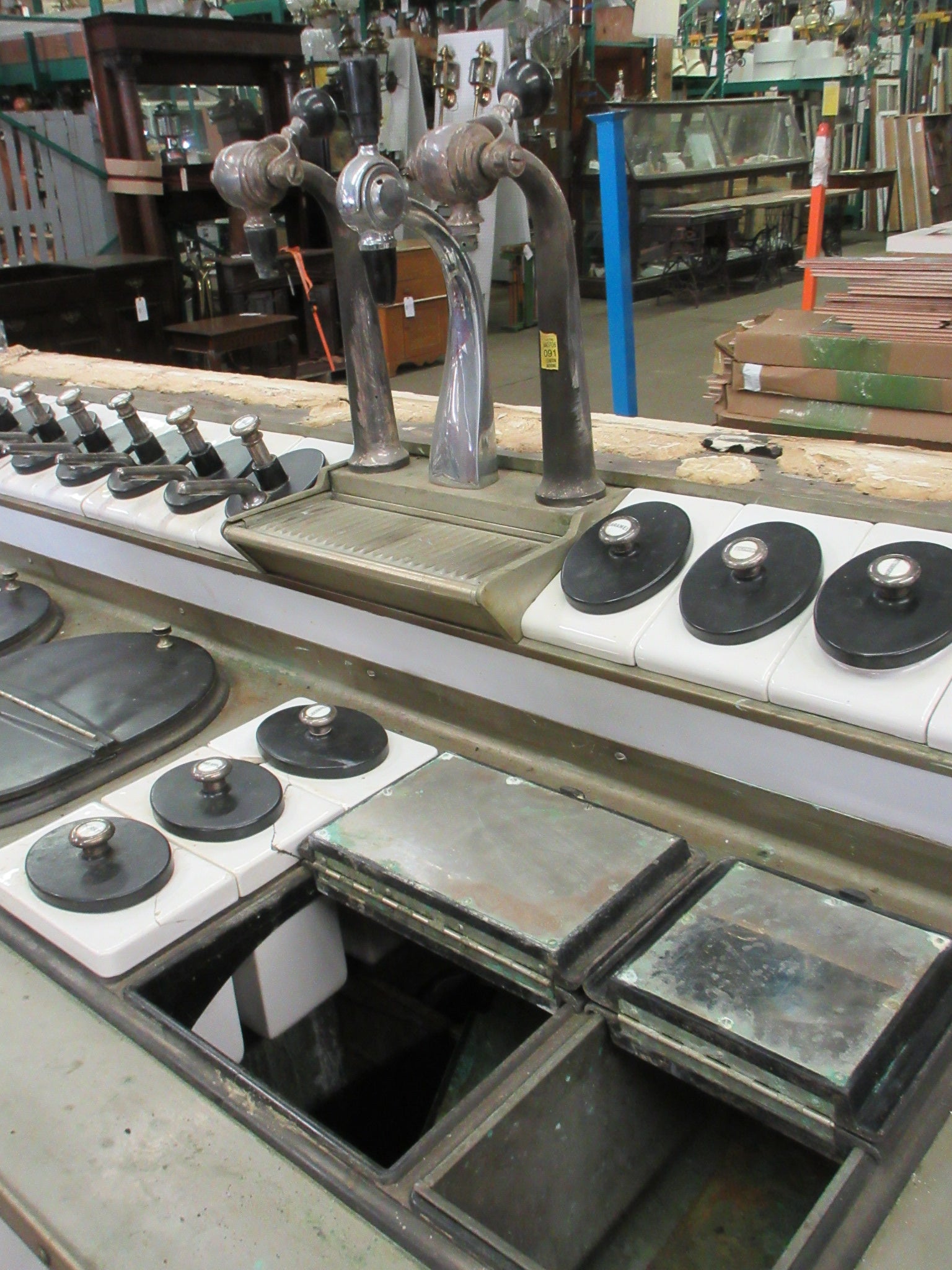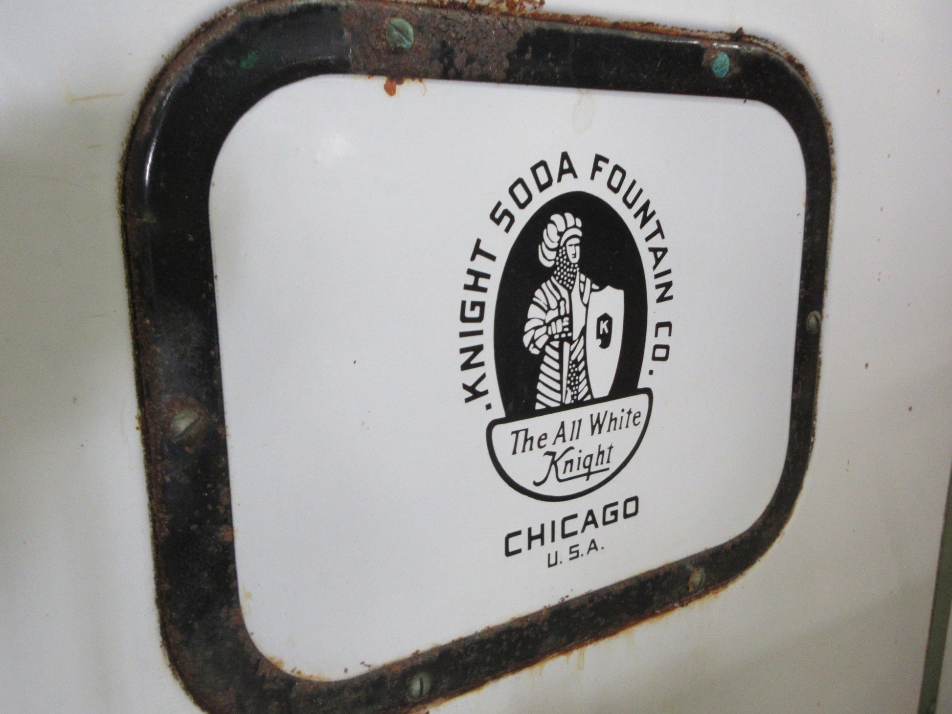 Description : Indulge in nostalgia with our Vintage Knight Soda Fountain Co. soda fountain counter – a treasure straight from the past. This delightful ensemble includes six swivel stools, an exquisite pink marble countertop, and an elegant backsplash. The original Frigidaire motor (sold as is) is included. Adorned with authentic brass hardware, charming bins, and serving ladles, alongside porcelain condiment wells, this fountain is a testament to timeless craftsmanship. Revel in the essence of a bygone era and make this iconic piece the heart of your space.