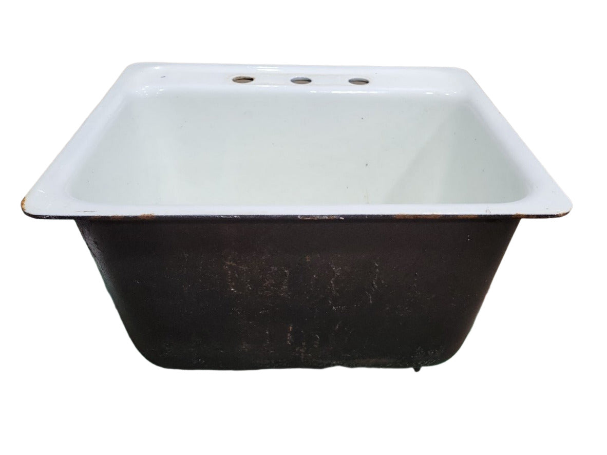 ![]() | Description : This is a vintage cast iron utility or laundry sink, manufactured by Kohler USA (Model: 14-12-78). It features a white enamel interior with a black porcelain exterior, showing natural age-related wear including rust on the underside and edges. The sink has a compact square shape with a deep bowl and includes a 3-hole faucet mount, common for wall or deck-mounted fixtures. The underside drain and stamped part number confirm its industrial-grade build, originally intended for residential or institutional use. It would make a durable and character-rich addition to any mudroom, laundry area, or retro-style bath renovation.
