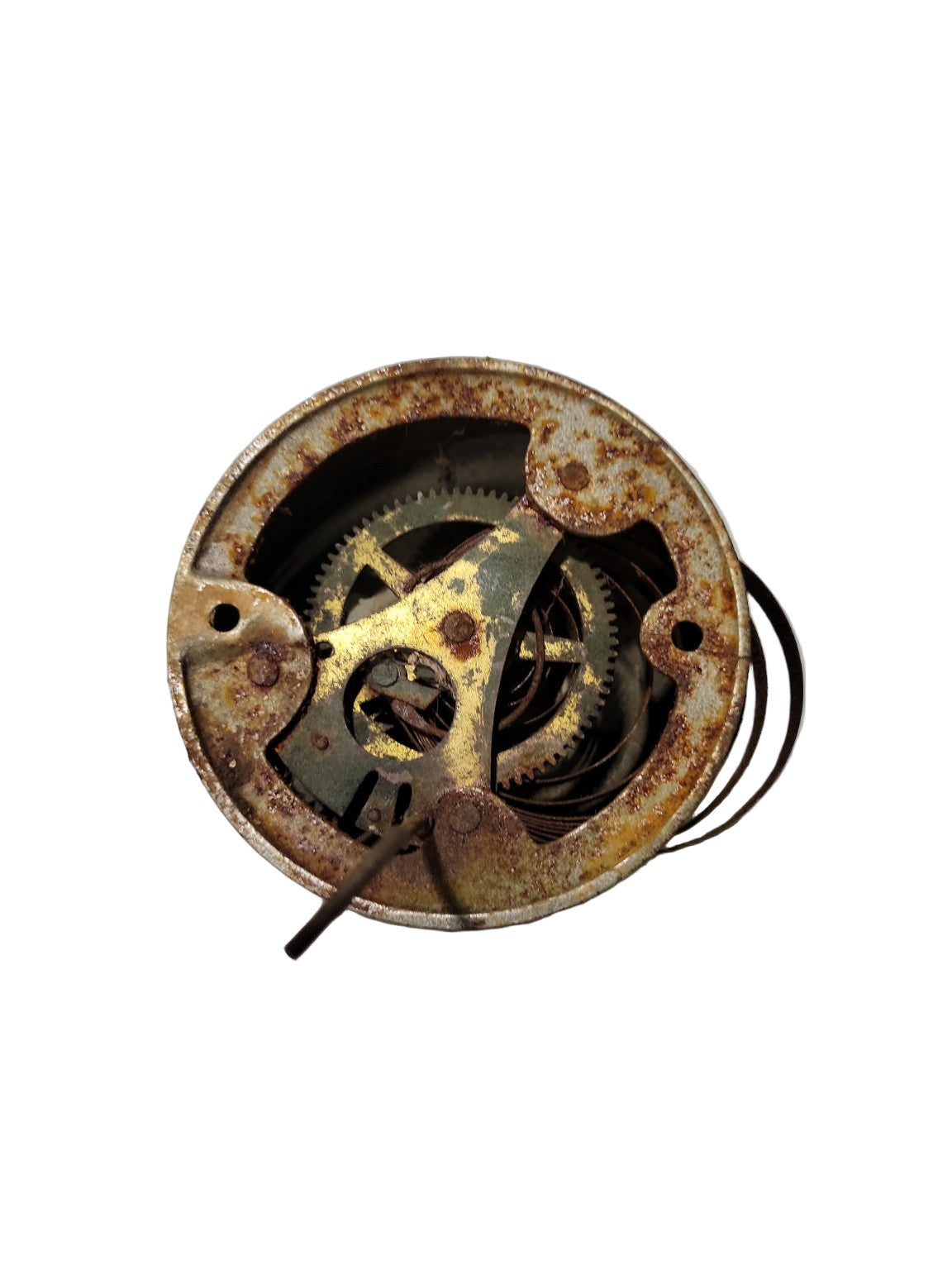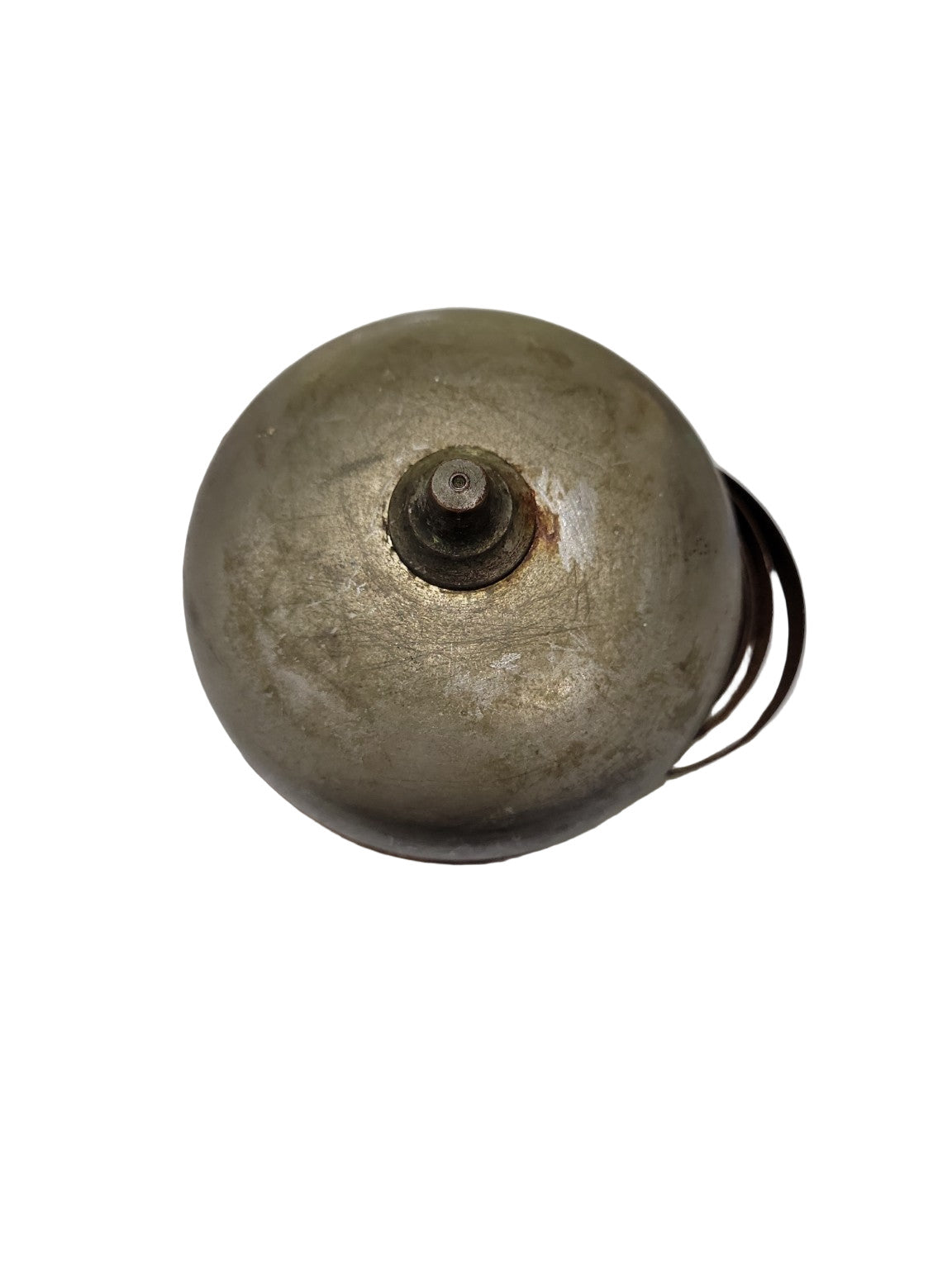 This vintage mechanical twist doorbell features a classic spring-driven bell mechanism mounted within a domed cast metal housing. Designed for use in early American homes, the bell was operated by a twist key mounted on the exterior door trim (now missing), which would trigger the internal gears to ring the bell inside. The exposed internal components reveal well-preserved gears and a coil spring, showing both craftsmanship and durability. Though missing the external twist key, the bell itself remains a functional and authentic architectural salvage piece—perfect for period restorations or as a display of early 20th-century home hardware.