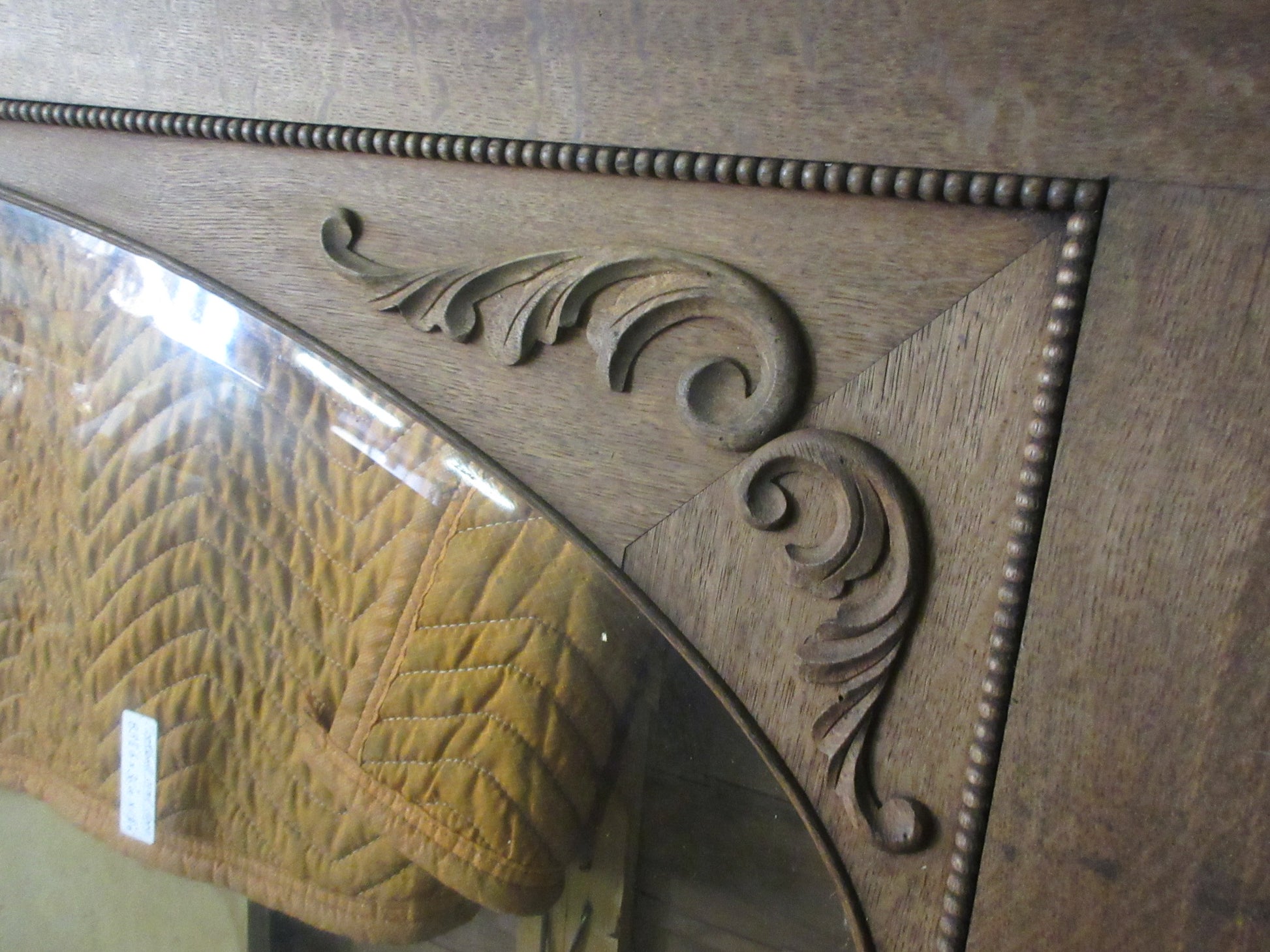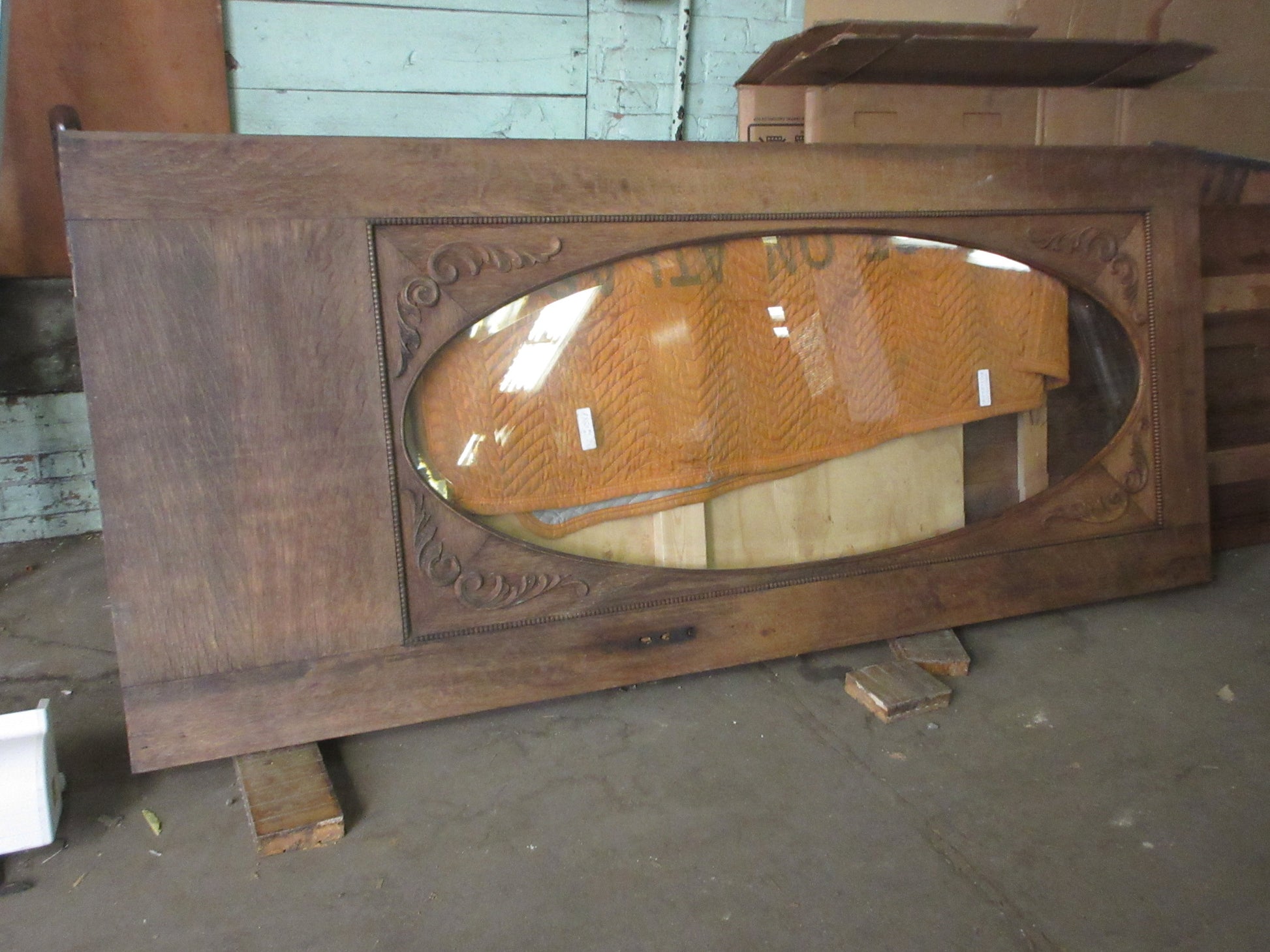 Description : Oak entry door with oval beveled glass, bead trim and carved scroll detail.
