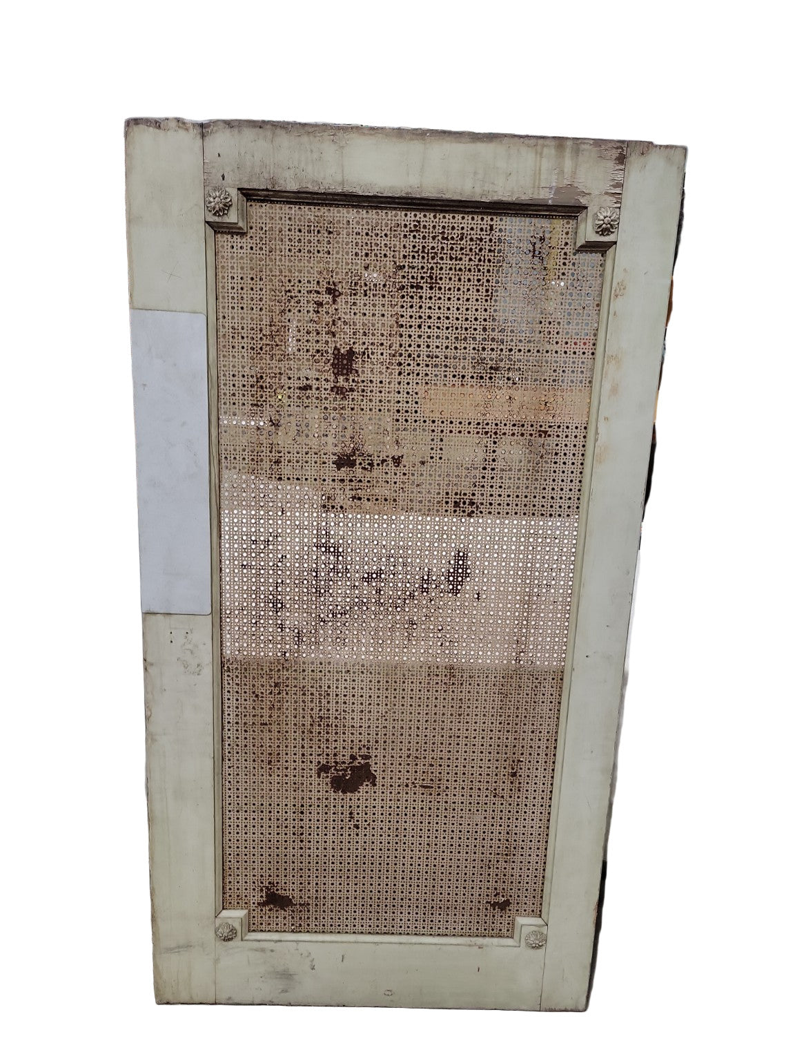 This tall decorative radiator cover panel features a distressed painted wood frame with a woven cane insert, originally designed to conceal radiators while allowing airflow. The open canework and floral corner rosettes add both form and function, making it a versatile architectural salvage piece. Its natural patina, wear, and chippy paint give it authentic vintage charm.