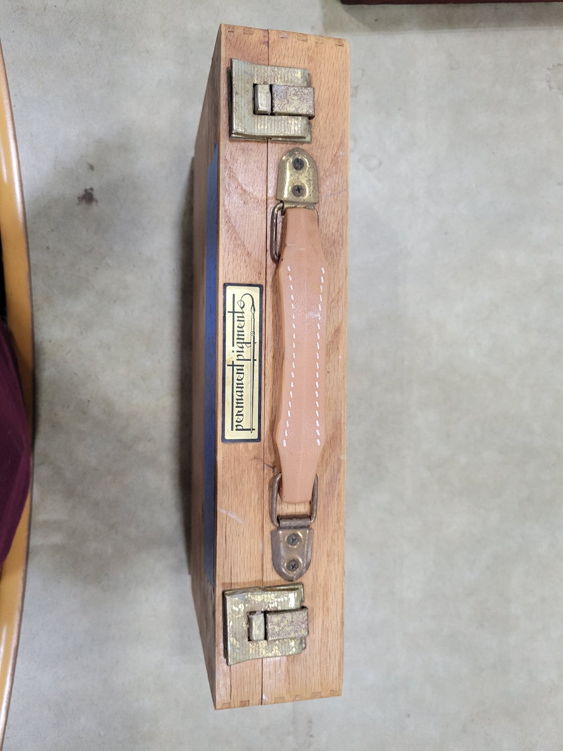 This charming vintage wooden artist’s box by Permanent Pigments houses a selection of oil paints, glazing mediums, and painting tools. The compact case features brass latches, a sturdy leather handle, and internal compartments for organized storage. The included supplies show light to moderate use, with original tubes of oil paint and jars of Winsor & Newton mediums. This kit is perfect for display, restoration, or even light use by a vintage art enthusiast.