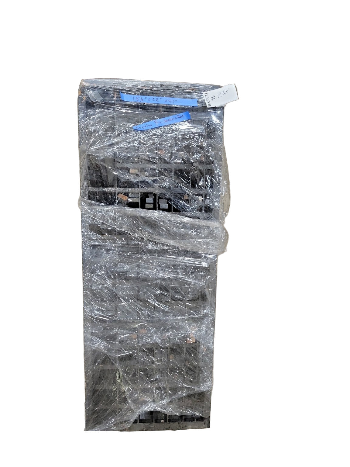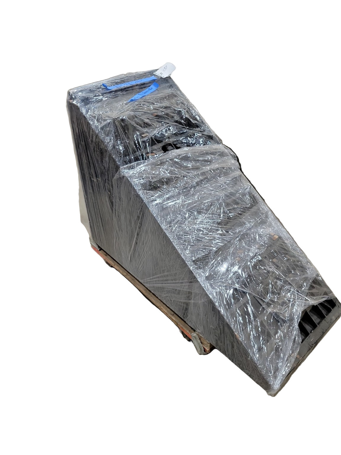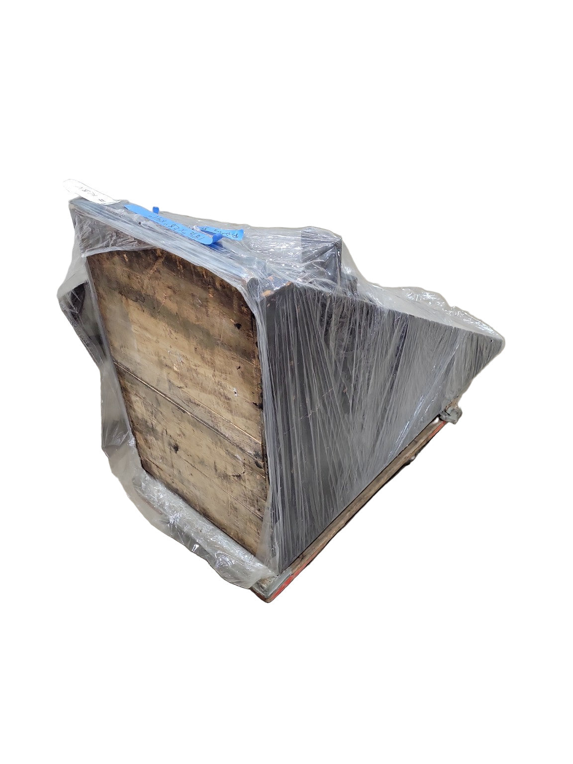 This vintage industrial printing press cabinet includes a full set of original metal spacers neatly organized within a multi-tier rack. Wrapped for protection and stability, the unit is built from heavy-gauge steel and features segmented trays used historically in typesetting and layout for letterpress printing. Its form is angled for ergonomic access, suggesting it was designed for shop-floor use. Whether repurposed for storage, display, or preserved as a piece of industrial history, this unit brings functional heritage to creative or workshop environments.