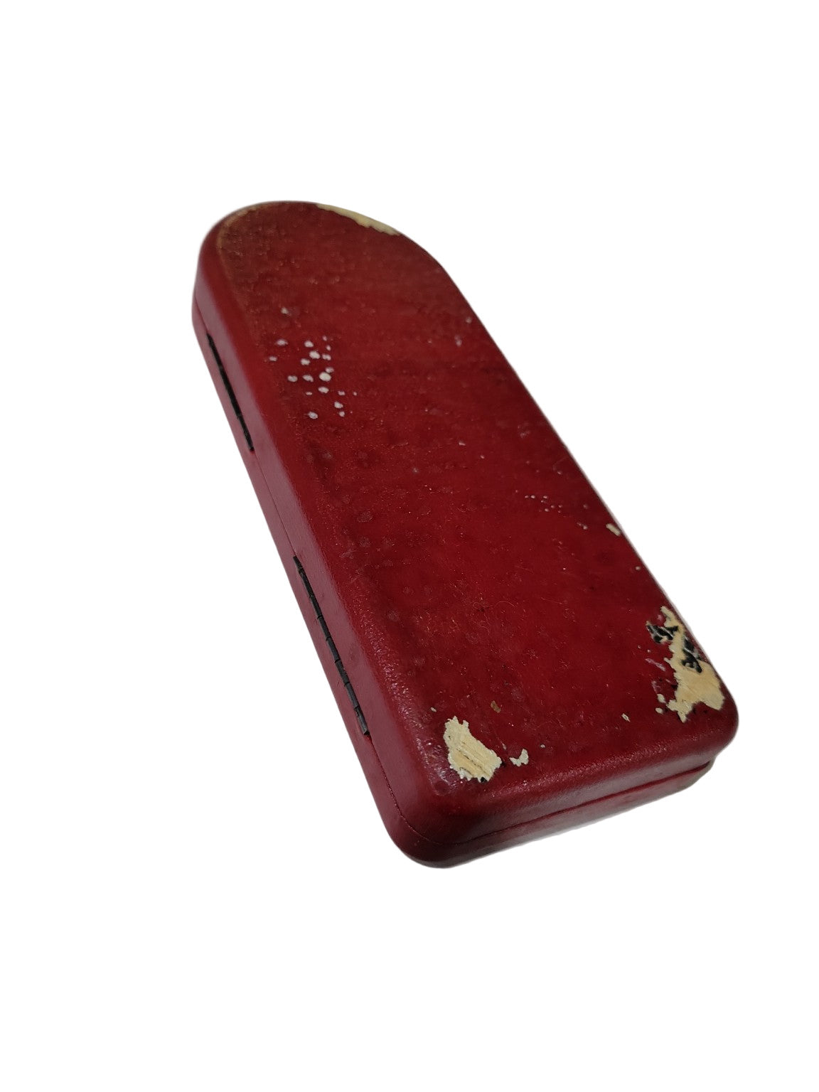This vintage Quikut Chef’s Steak Set features six precision-ground stainless steel knives with smooth ivory-colored handles, elegantly housed in a red hard-shell presentation case lined with cream satin and burgundy velvet. The knives are labeled “Custom Ground,” reflecting the brand’s mid-century dedication to craftsmanship and functionality. Compact, stylish, and practical, this set captures the charm of postwar American kitchenware—where everyday tools were designed to be both durable and beautiful.