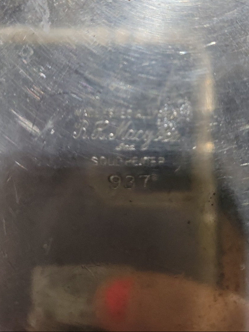 Maker: Made Especially for R.H. Macy & Co., marked Solid Pewter 937 (likely produced by a specialized American pewter firm contracted by Macy’s, such as Old Colony Pewter or Wilton-Columbia).