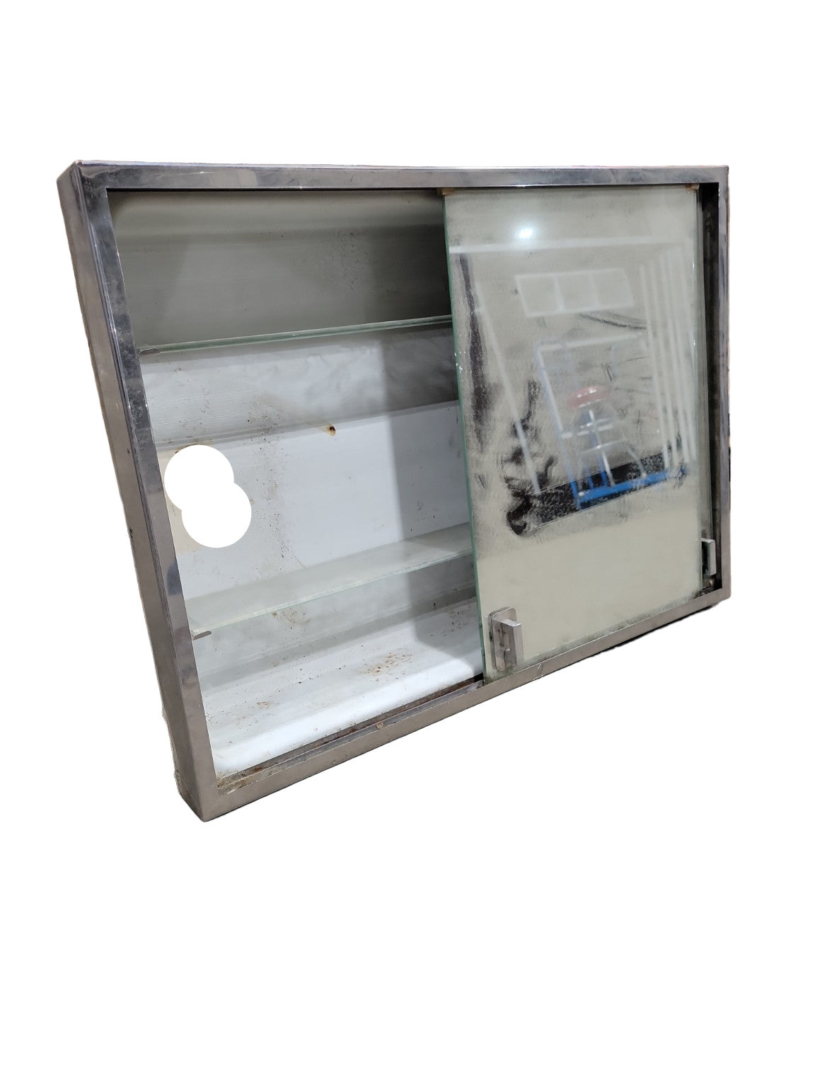 This vintage recessed metal medicine cabinet features dual sliding mirror doors framed in chrome, a white enameled interior, and two glass shelves. The mirrors show age-related wear and spotting, while the enamel interior retains a classic mid-century charm. This piece can be restored for everyday use or left as-is for an authentic vintage look in a bathroom remodel or retro-inspired space.