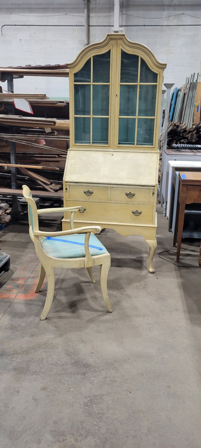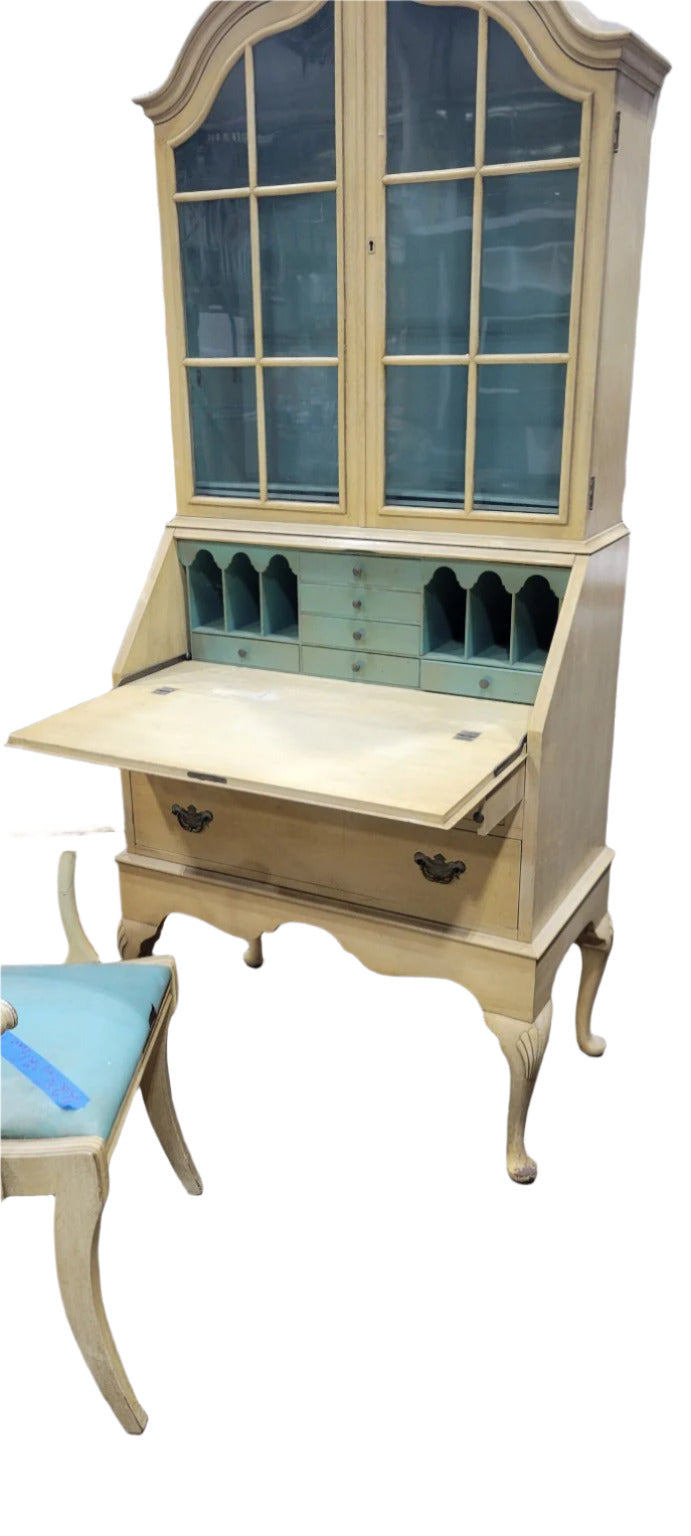 A stunning two-piece secretary desk with a hutch, featuring glass-paneled doors, a fold-down writing surface, and multiple drawers and cubbies. Finished in a distressed cream tone with a soft blue interior.