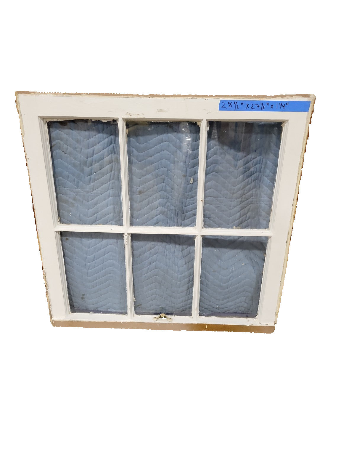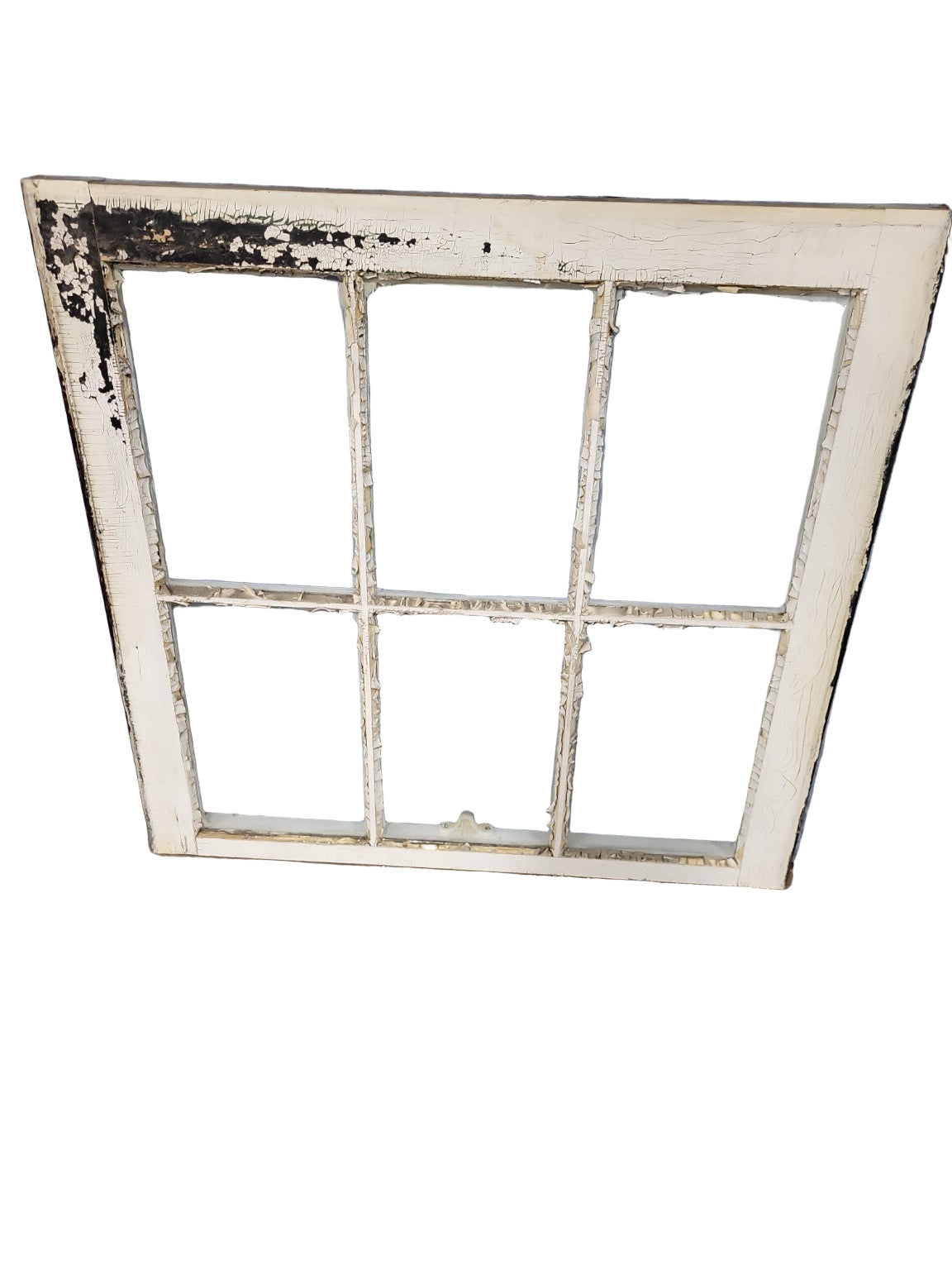 This vintage six-pane wood window features a classic divided-light design with original glass set into a solid wood frame. The layered white enamel paint shows natural crackling and chipping, giving each piece a genuine aged character. The glazing remains largely intact, with minor wear consistent with age. Perfect for restoration, greenhouse builds, or repurposing into mirrors, wall décor, or furniture accents.