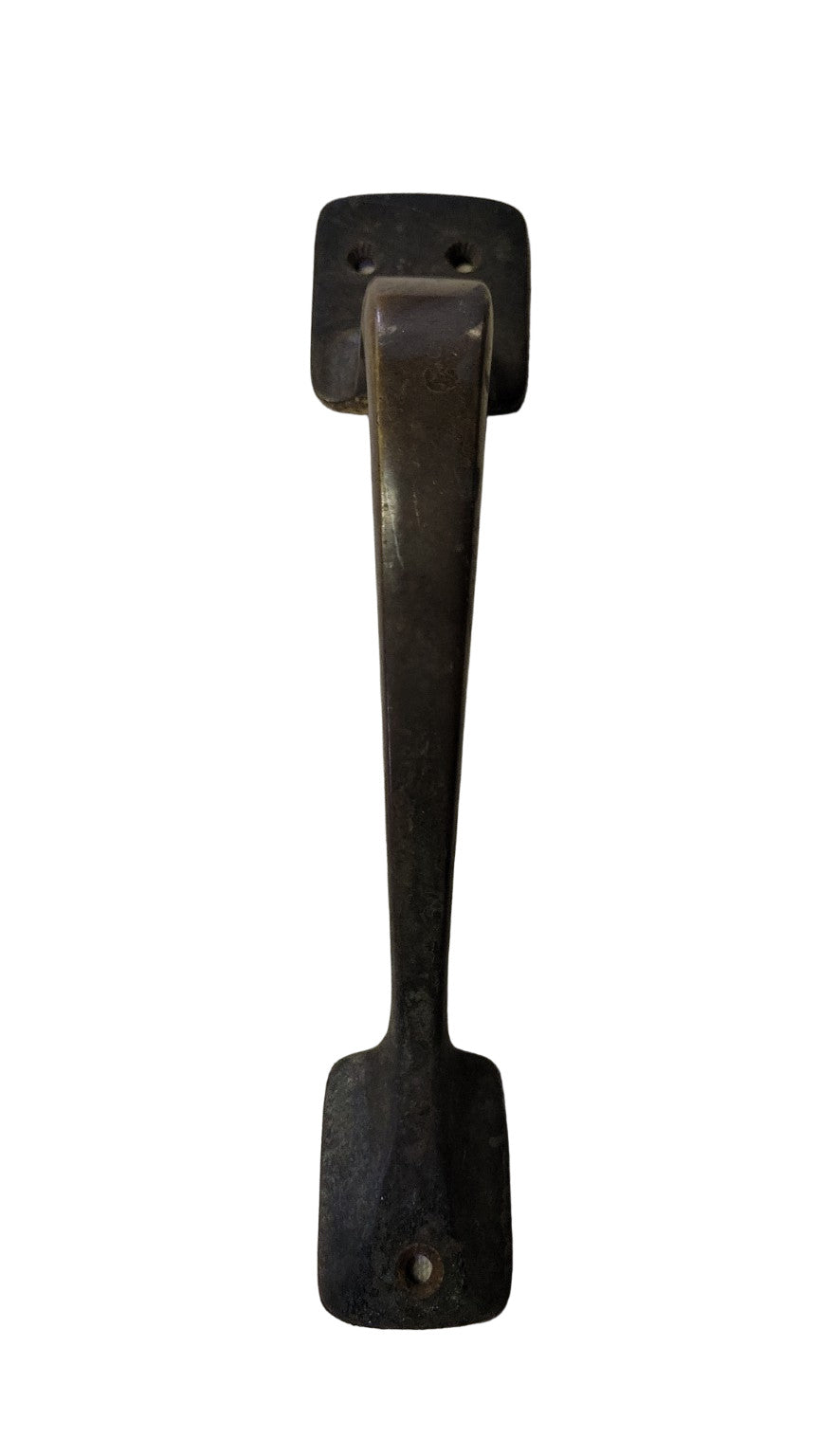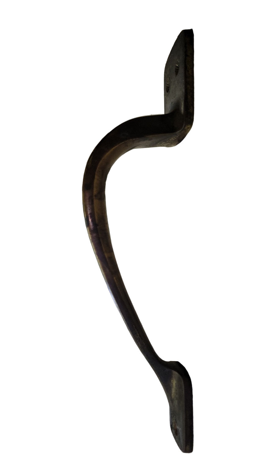 This vintage solid brass door pull handle features a sturdy rectangular profile with a slightly arched grip and wide flat mounting points. Designed for use in commercial or institutional settings, the piece is finished with a naturally aged patina and subtle surface wear. The solid brass construction ensures lasting durability and makes it suitable for restoration projects or architectural salvage reuse.