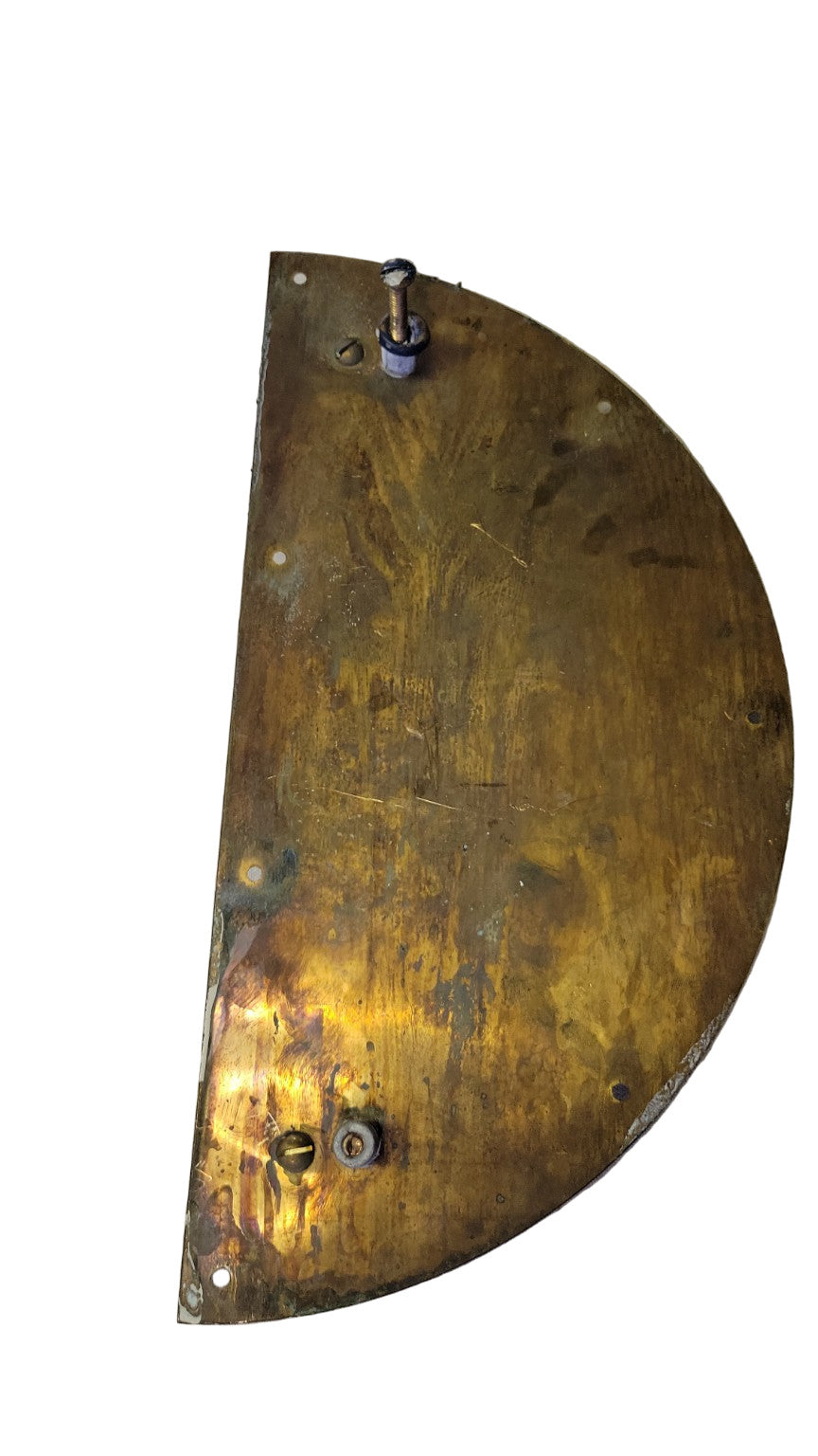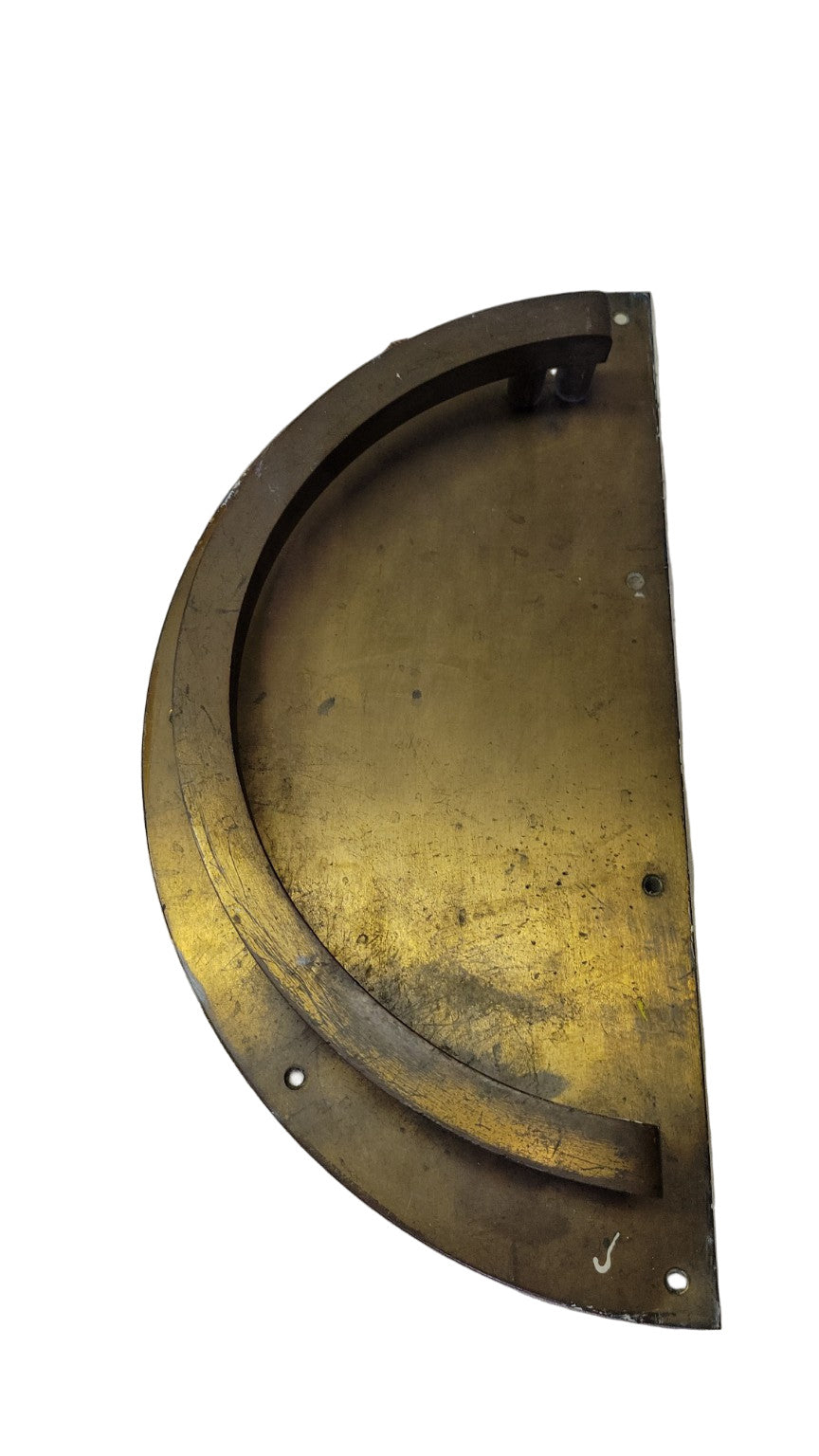 This vintage solid brass door pull features a distinctive half-round profile, commonly used on commercial glass or metal entry doors. The curved form and integrated threaded mounts are designed for flush exterior installation, while the solid brass construction provides weight and durability. It displays a deep, aged patina with signs of use, making it suitable for both restoration and modern industrial applications.