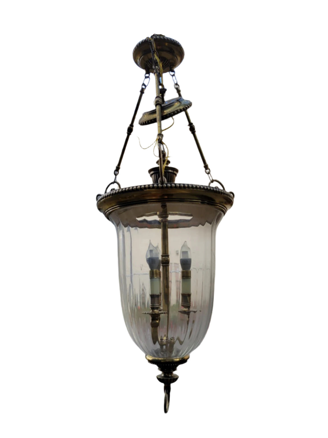 This stately vintage hall lantern pendant features a fluted glass dome suspended by three solid brass rods with detailed finials and beaded edging. The oversized hurricane-style globe encases three upright candle-style sockets on a central brass stem. Its elegant neoclassical proportions, complete with acorn finials and ornamental hooks, make it a refined statement for entryways, stairwells, or formal corridors. The glass is ribbed and lightly tinted, and the brass retains a warm polished finish with minor age-appropriate patina. Wiring is intact but untested and may require modernization.