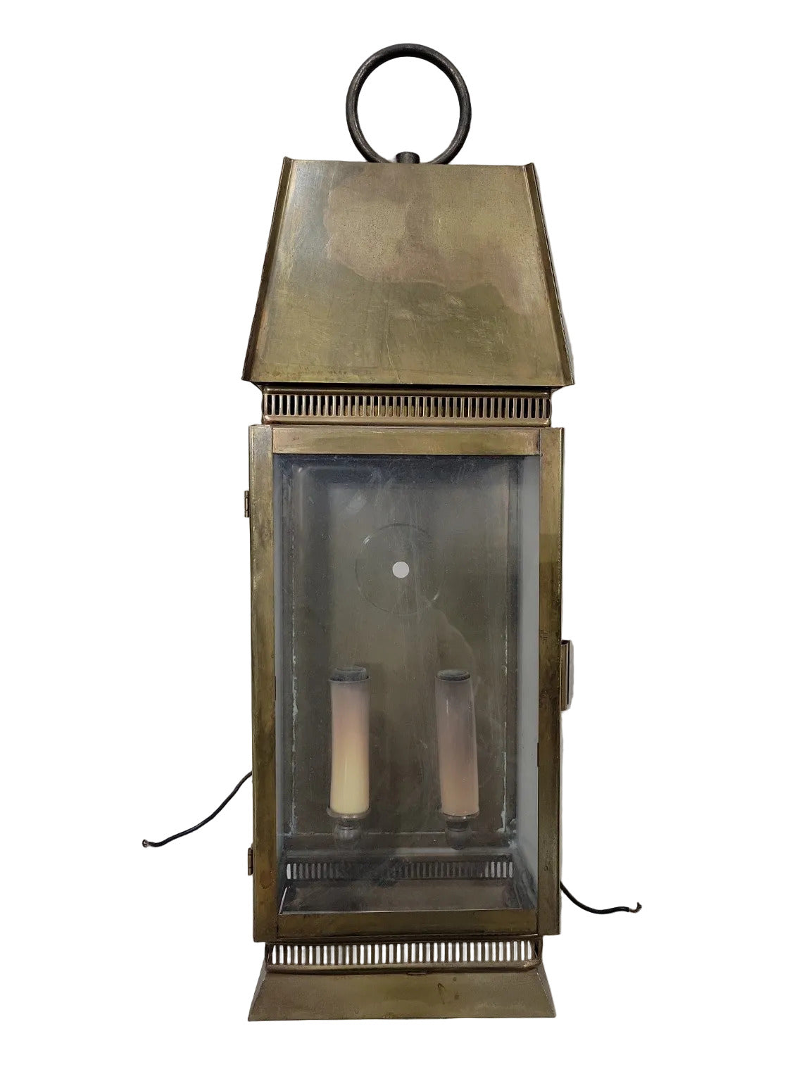 This vintage solid brass wall lantern blends functional outdoor lighting with a timeless colonial aesthetic. Featuring a tall trapezoidal body and a hinged front panel for easy access, the design includes finely slotted vent detailing at both the top and bottom for added visual interest and airflow. With two candle-style sockets housed behind clear glass, this fixture is UL-listed for wet locations, making it ideal for porches, patios, or entryways. Its patinaed brass surface enhances its historic appeal, while the minimal yet stately form lends itself to both traditional and transitional architecture.
