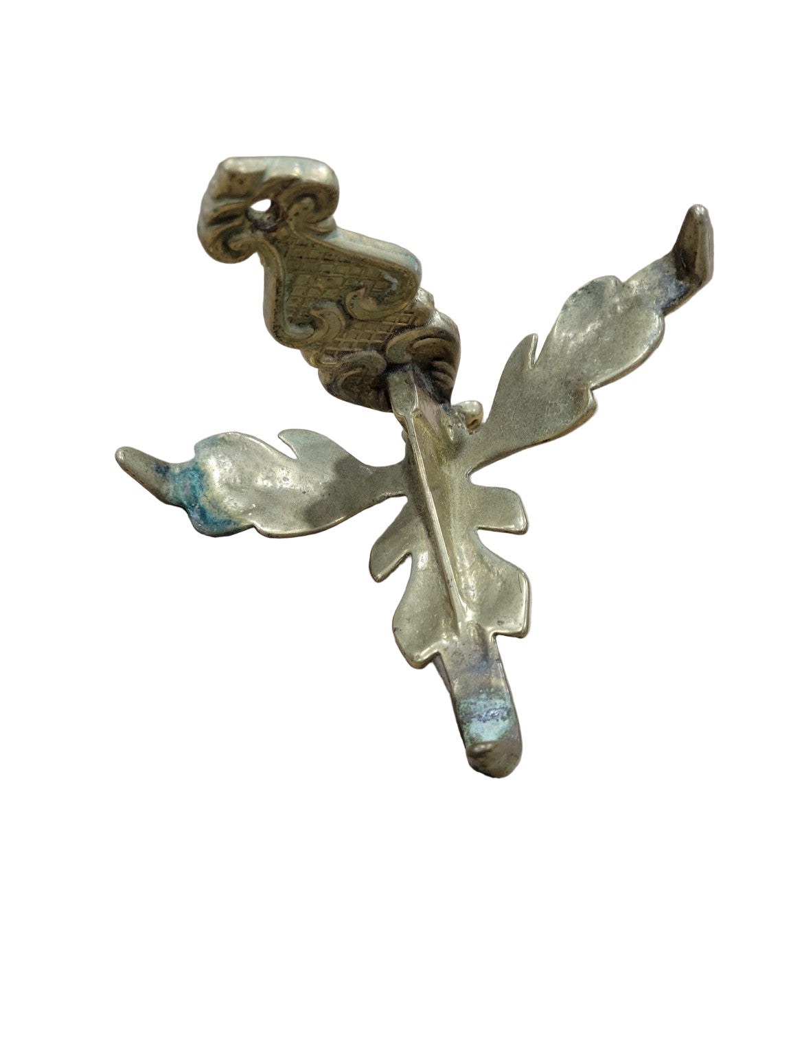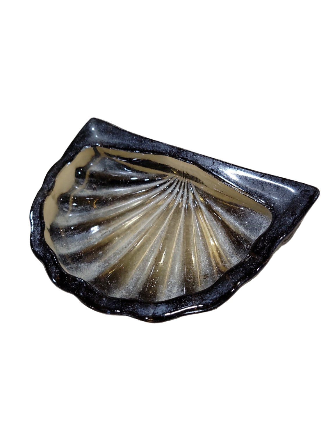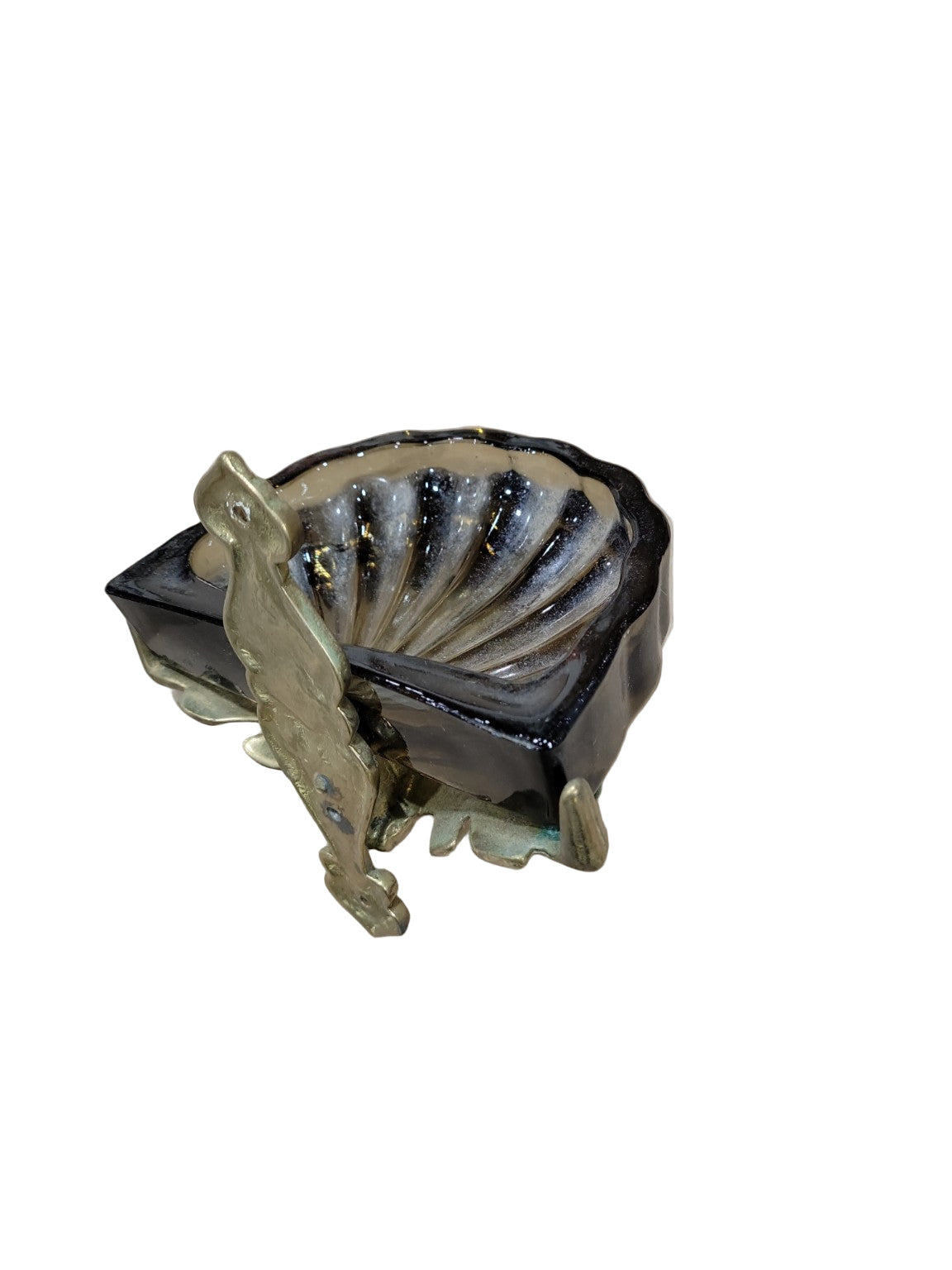 This vintage wall-mounted soap dish features a scalloped amber glass basin with fan-shaped ridges, paired with a highly decorative cast brass bracket in a floral and scroll motif. The brass hook at the front is ideal for hanging a washcloth or brush, enhancing both function and charm. The combination of dark translucent glass and aged brass gives this piece an elegant, Old World aesthetic perfect for vintage bathrooms or eclectic interiors. Some patina and verdigris on the brass elements adds to its antique appeal.