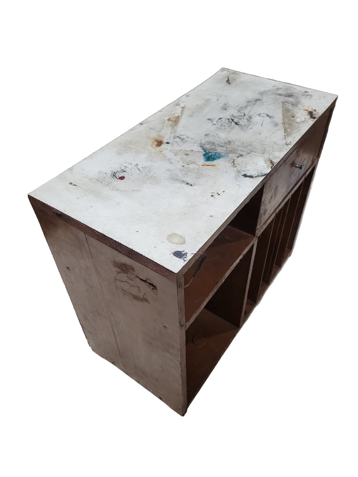 A utilitarian vintage desktop organizer, built from plywood with a painted surface and laminate top. This compact unit features a locking drawer (key not included), open storage cubbies, and vertical slots—ideal for holding files, documents, or even small tools. Its original brown paint and aged laminate show signs of use, with visible wear, scratches, and stains that mark its previous life in a workshop or office. Its rugged charm and modular form offer strong potential for restoration or repurposing in a craft studio, retail display, or mail sorting setup.