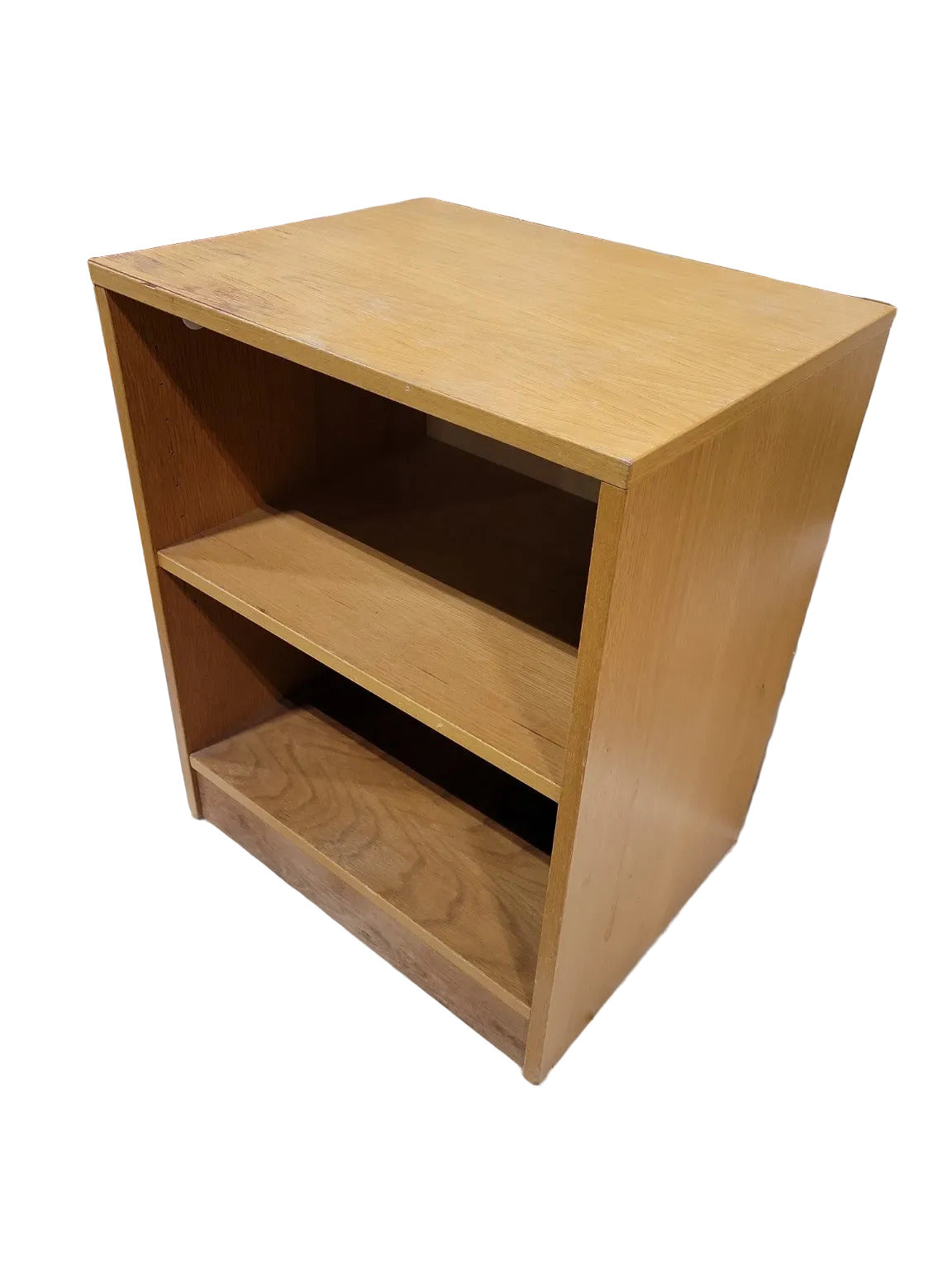 Description : This compact utility cabinet features a blonde wood veneer over particleboard construction, complete with a single adjustable shelf and a solid kick base. Circular cutouts on both interior sides suggest previous cable or equipment access, making it ideal for repurposing as a media stand, nightstand, or small storage unit. The surface wear on the top adds to its authentic vintage character while leaving it ready for a quick refinish or paint. Versatile and functional, it’s a great candidate for both restoration and upcycling projects.