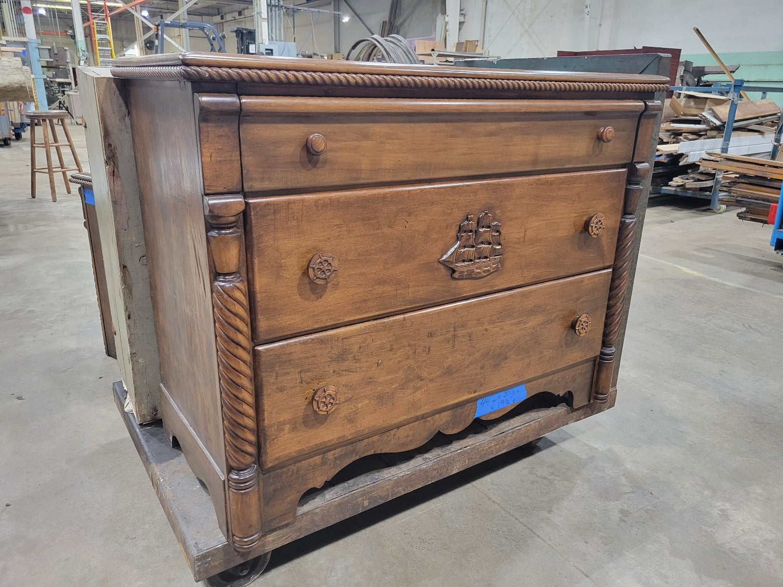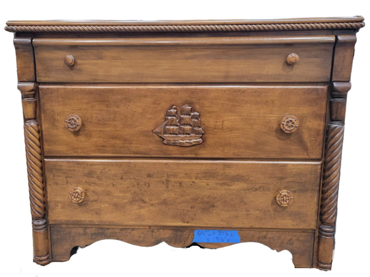 This solid wood dresser by Virginia House features a carved rope-edge top, turned columns, and classic colonial details. The standout feature is its nautical theme, with a hand-carved tall ship centered on the middle drawer and helm-inspired knobs on the lower drawers. All three drawers are present and functional, with the interior of the top drawer painted in a slate blue and featuring a built-in tray. The only missing element is the back panel, which normally sits flush against the wall—an easy fix for restoration or direct placement against a surface. Perfect for themed spaces, bedrooms, or cottage-style interiors.