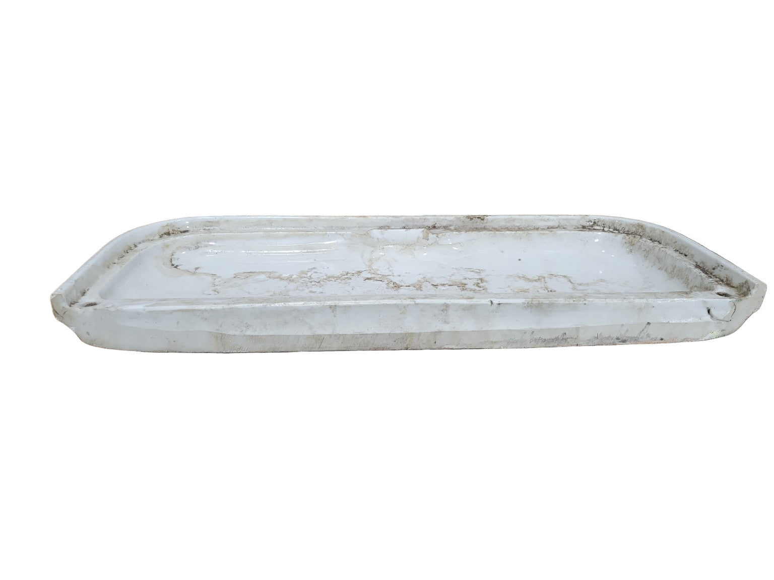This vintage vitreous china toilet tank lid features a gently rounded edge and a smooth glazed finish, designed to fit standard mid-to-late 20th century rectangular tanks. The piece shows light interior residue and wear consistent with storage but no major chips or cracks, maintaining full structural integrity. Its minimalist, functional shape aligns with American-made tanks from the 1970s through 1980s—an excellent match for restoration or replacement use.