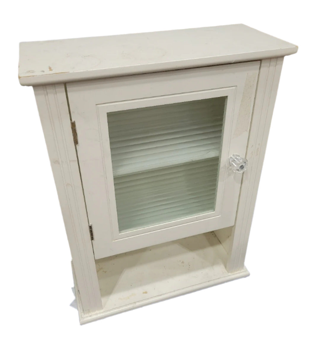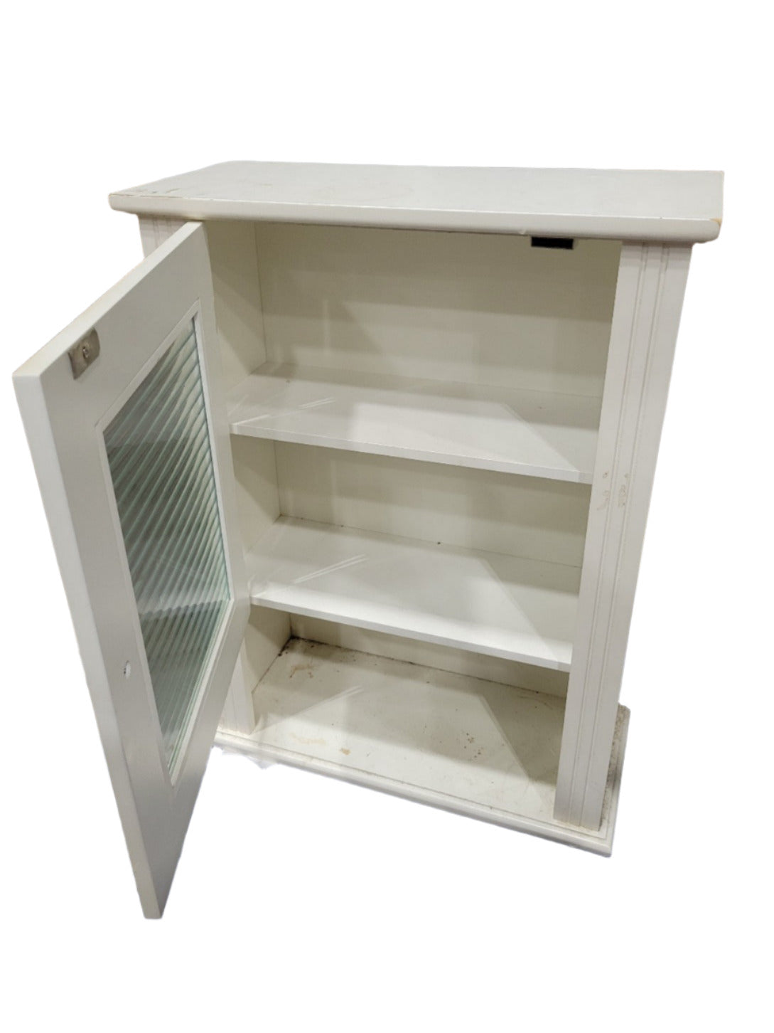 This compact wall-mounted cabinet features a clean white finish and a single front door with textured ribbed glass. Its classic rectangular frame is fitted with a faceted glass knob and two interior shelves, providing discreet but stylish storage for toiletries, kitchen items, or small décor. The cabinet’s dimensions make it ideal for bathrooms, laundry rooms, or vintage-inspired kitchens. Back keyholes are pre-drilled for secure hanging.