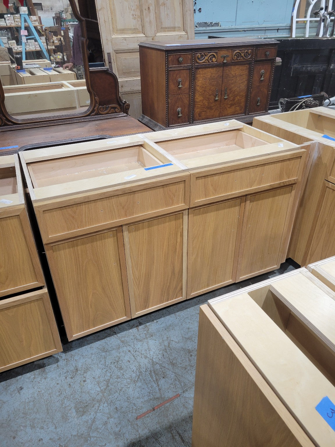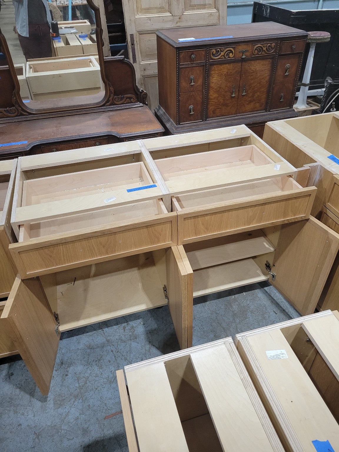Description : This spacious white birch double base cabinet offers flexible storage with a wide, functional layout. It features two upper drawers for organizing utensils, tools, or supplies, and two lower double-door compartments with internal shelves for larger storage needs. Built with a clean recessed panel design and finished in a warm white birch veneer, this cabinet is sturdy, modern, and perfect for kitchens, laundry rooms, or creative workshops. Light surface wear from salvage is present but overall the cabinet remains in strong, reusable condition.