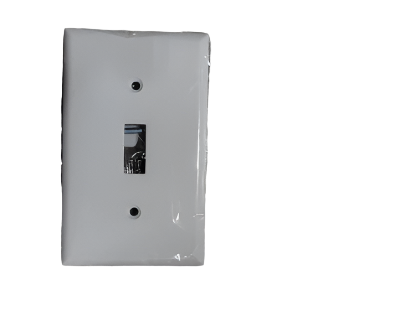 Description : Standard single-gang white toggle switch cover plate made from smooth thermoplastic. Comes individually packaged with two mounting screws and labeled hardware. Designed for residential or commercial electrical outlets to provide a clean, finished look.