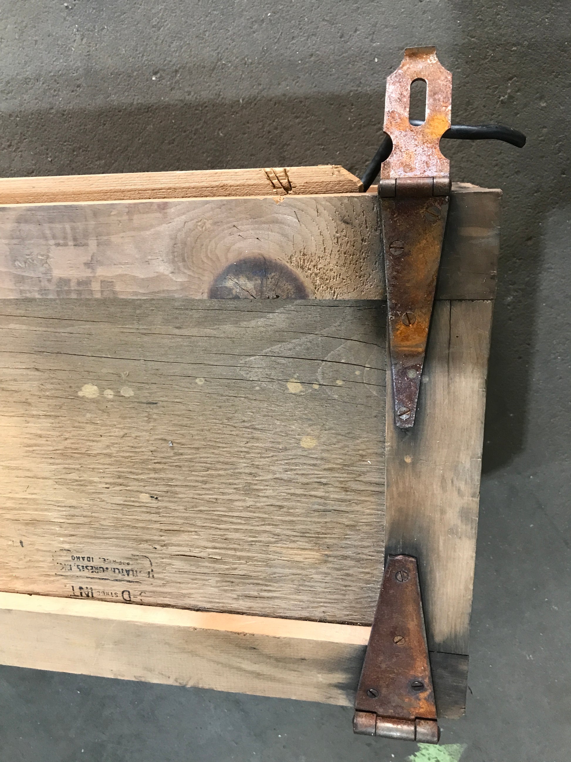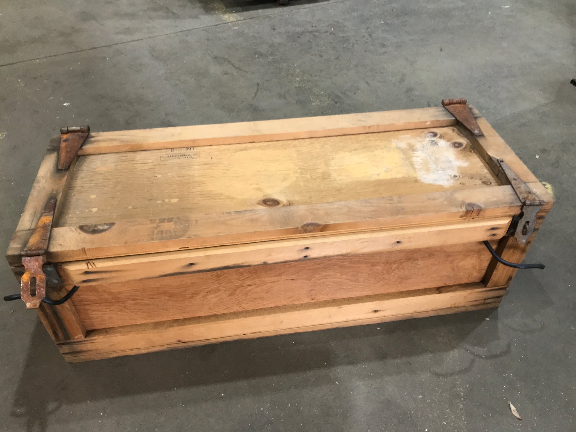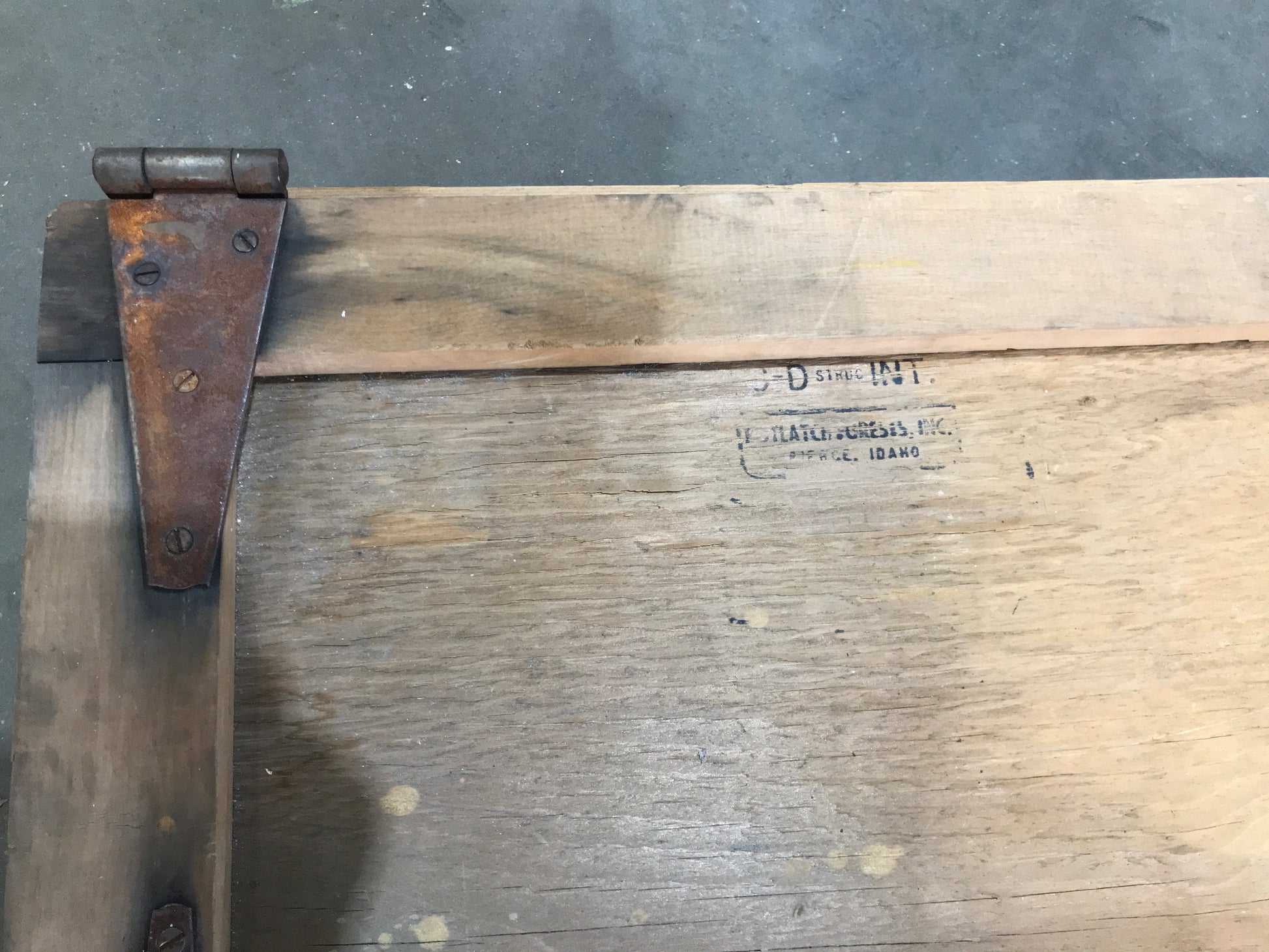 Description : Wooden crate/ chest with hinges and latches. Stamped with C-D struct INT Latch. Idaho.