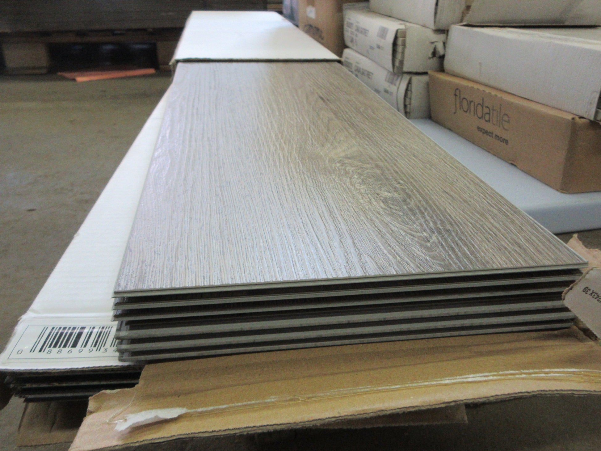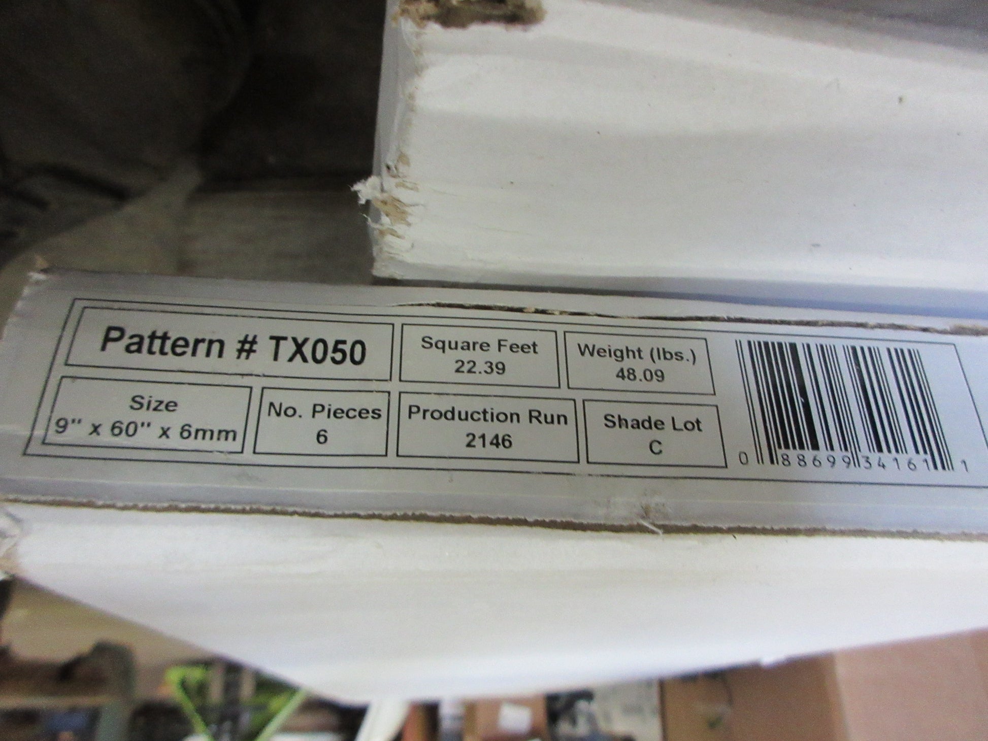 Description : Wood grain finish laminate flooring slats, two boxes with six pieces each. Measures 9" x 60" for a rough total of 22 square feet.