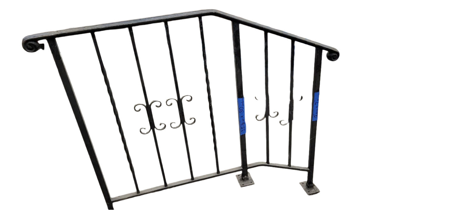 Wrought iron railings have been widely used in architecture for centuries, offering durability and aesthetic appeal. This piece likely originated from a residential or commercial property, repurposed for reuse.