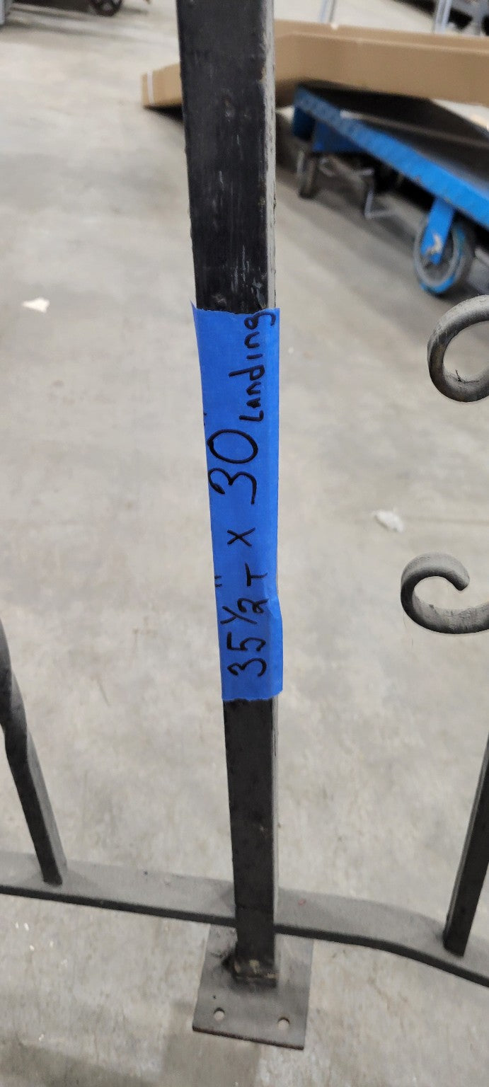 Description : This vintage wrought iron stair railing features a sturdy frame with decorative scrollwork and twisted balusters. It has a slightly angled design, making it ideal for stairways, porches, or patios. The railing includes two mounting plates at the base for secure installation. The curved handrail ends add a touch of elegance to the utilitarian structure.